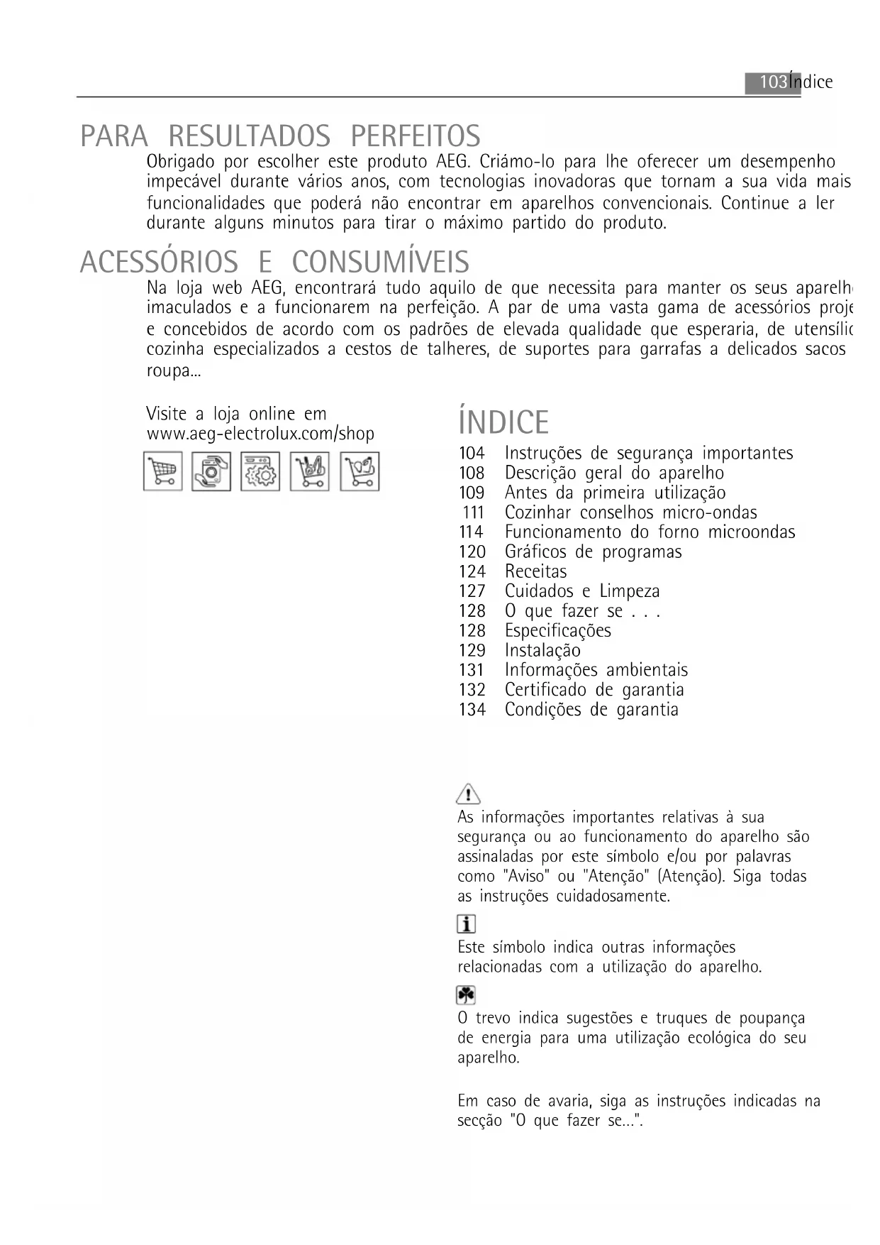 Na loja web AEG, encontrará tudo aquilo de que necessita para manter os seus aparelhos AEG imaculados e a funcionarem na perfeição. A par de uma vasta gama de acessórios projectados e concebidos de acordo com os padrões de elevada qualidade que esperaria, de utensílios de cozinha especializados a cestos de talheres, de suportes para garrafas a delicados sacos para roupa... As informações importantes relativas à sua segurança ou ao funcionamento do aparelho são assinaladas por este símbolo e/ou por palavras como "Aviso" ou "Atenção" (Atenção). Siga todas as instruções cuidadosamente. Este símbolo indica outras informações relacionadas com a utilização do aparelho. O trevo indica sugestões e truques de poupança de energia para uma utilização ecológica do seu aparelho. Em caso de avaria, siga as instruções indicadas na secção "O que fazer se…". ÍNDICE Visite a loja online em www.aeg-electrolux.com/shop