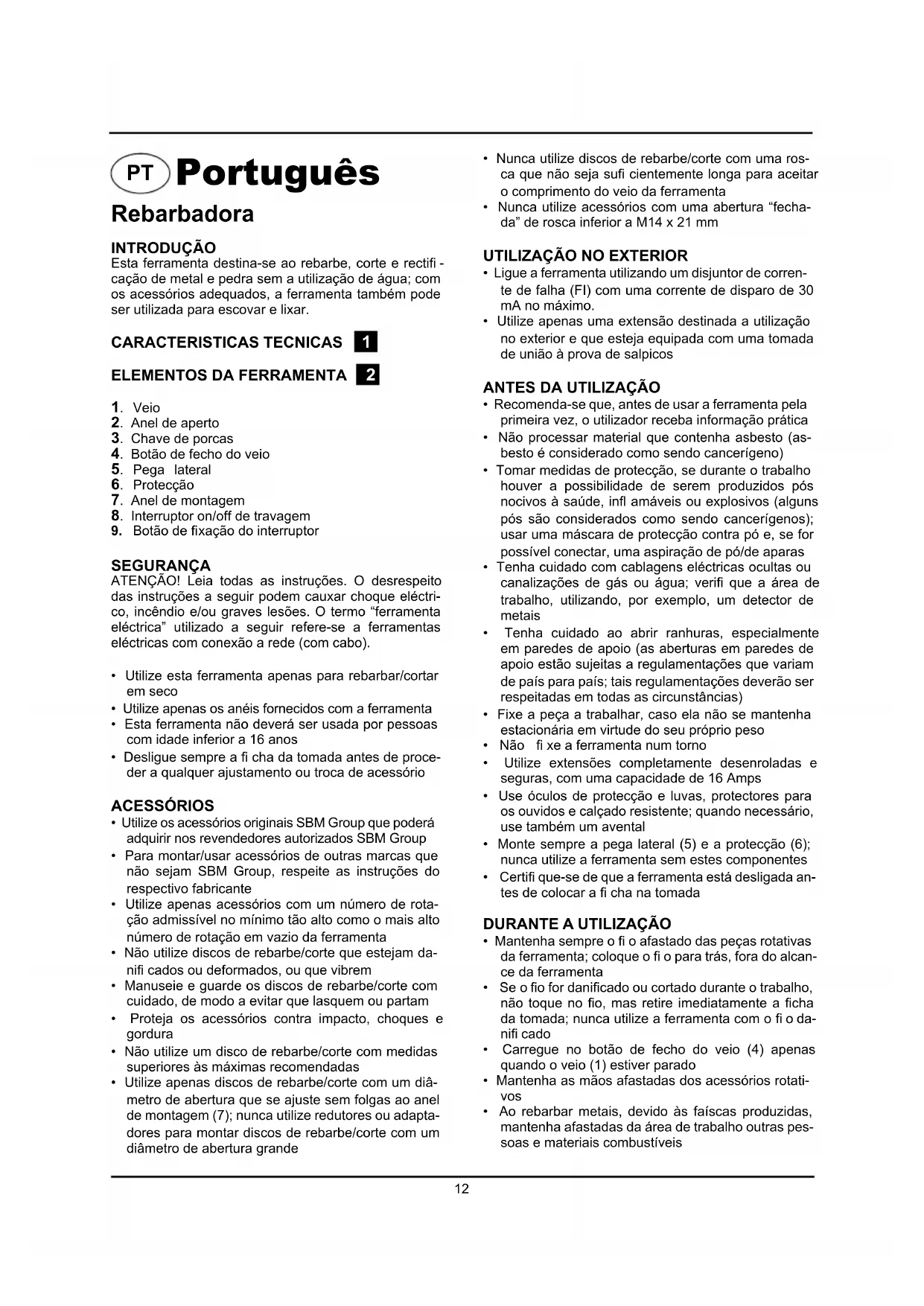 Português Rebarbadora INTRODUÇÃO Esta ferramenta destina-se ao rebarbe, corte e rectifi -cação de metal e pedra sem a utilização de água; com os acessórios adequados, a ferramenta também pode ser utilizada para escovar e lixar. CARACTERISTICAS TECNICAS 1