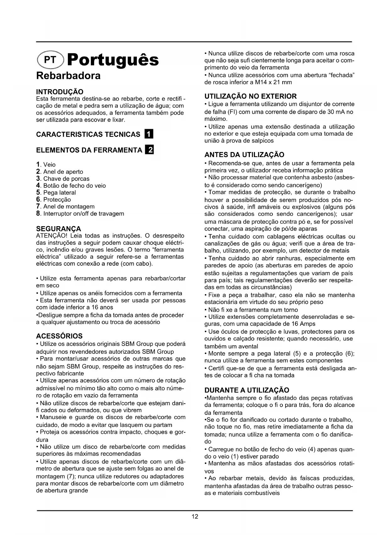 Português Rebarbadora INTRODUÇÃO Esta ferramenta destina-se ao rebarbe, corte e rectifi -cação de metal e pedra sem a utilização de água; com os acessórios adequados, a ferramenta também pode ser utilizada para escovar e lixar. CARACTERISTICAS TECNICAS 1