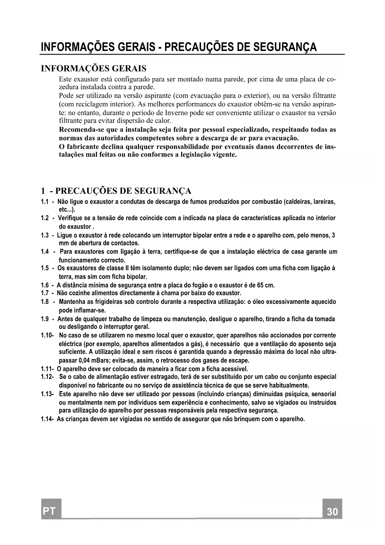 1.1 - Não ligue o exaustor a condutas de descarga de fumos produzidos por combustão (caldeiras, lareiras,