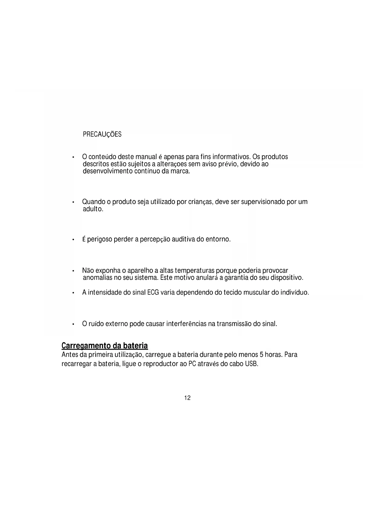 - O ruído externo pode causar interferências na transmissão do sinal. Carregamento da bateria Antes da primeira utilização, carregue a bateria durante pelo menos 5 horas. Para recarregar a bateria, ligue o reproductor ao PC através do cabo USB.13 Botões Funcionamento básico Ligar: Mantenha pressionado o botão 5 durante 3 segundos para ligar o dispositivo. Desligar: Mantenha pressionado o botão 5 durante 3 segundos para desligar o dispositivo. Note-se que o dispositivo desliga-se automaticamente quando a bateria esteja no mínimo. Ajuste do volume: Para aumentar ou diminuir o volume um nível, você pode pressionar [VOL-] ou [VOL +], desde o modo MP3, o modo AMV / AVI, o modo de14 gravação e o modo de rádio FM. Mantendo pressionado o botão [VOL-] ou [VOL +] aumentará ou diminuirá o volume continuamente. Menu principal Pressione o botão 5 para acessá-lo. Há sete modos que você pode mudar entre si selecionando um ou outro com os botões 6 e 7.15 Modo pedômetro Escolha o modo de pedômetro. Pressione o botão 5 para acessá-lo. Abaixo encontrará os seguintes ícones. Quando você seleccione a opção de "Pedômetro" poderá escolher o peso do seu corpo para iniciar o pedômetro. Quando você pare o pedômetro, o número exibido (por exemplo, 000032) é o número total de passos andados; enquanto colocadas sob o botão para parar (Stop), você poderá ver as estatísticas do exercício: Tempo: o tempo total utilizado KM: A distância total Calorias: Total de calorias queimadas Para ver o seu "Historial", selecione "Historial". Escolha as datas que você quer saber. Este dispositivo é capaz de armazenar um ano de historial.16 Observe que você pode ouvir a música enquanto use a função de pedômetro. Modo relógio No menu principal, pressione os botões 6 ou 7 para selecionar o modo de relógio, e pressione 5 para acessar nesta função. Para ajustar o submenu de Data e Hora, siga estes passos seguintes:17 Cronômetro No menu principal, pressione os botões 6 ou 7 para selecionar a cronômetro, e depois pressione o botão 5 para acessar a função de cronômetro.