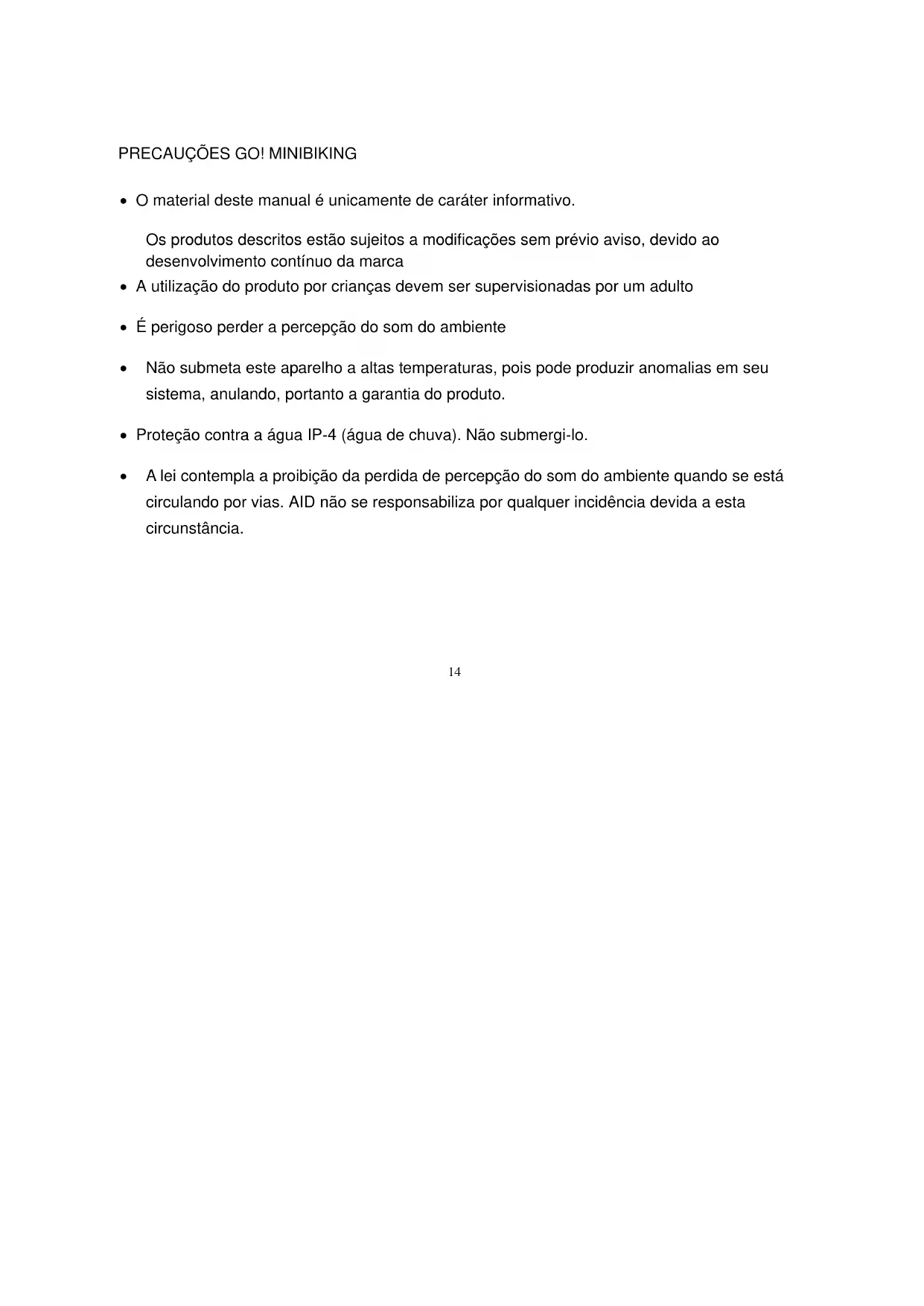 - A lei contempla a proibição da perdida de percepção do som do ambiente quando se está circulando por vias. AID não se responsabiliza por qualquer incidência devida a esta circunstância.15 Manual de Utente O reprodutor de música MP3 portátil Minibiking pode produzir som claro e natural com distintos níveis desde a palma da sua mão. O embalagem do produto contém o seguinte: - reprodutor de música portátil MP3 Minibiking - Cabo USB de 3.5 mm - Suporte para bicicletas - Uma capa protectora Caraterísticas do Produto: - Capa de metal de alumínio com tratamento em superfícies de alta textura que facilita o seu uso tanto em interiores quanto em exteriores. - Alto-falante Hi-Fi de tipo monomero com acústica de alta fidelidade e efeitos de som incorporados. - Bateria de Lítio de alta capacidade. - Quando esteja a usar os auriculares, o alto-falante fechar-se-á automaticamente. - Os auriculares integrados, o USB e a função de carga estão integrados numa só cravelha para fazer o produto mais simples e efetivo.16