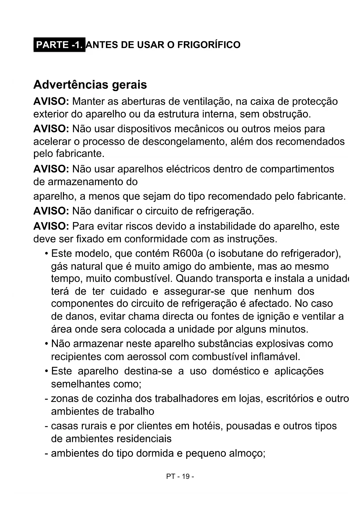 PARTE -1. ANTES DE USAR O FRIGORÍFICO Advertências gerais