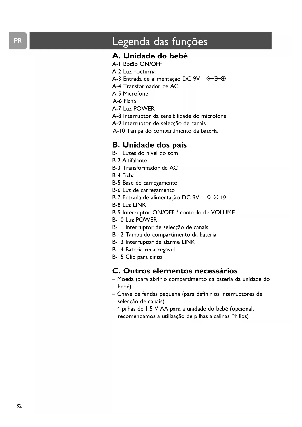 – 4 pilhas de 1,5 V AA para a unidade do bebé (opcional,