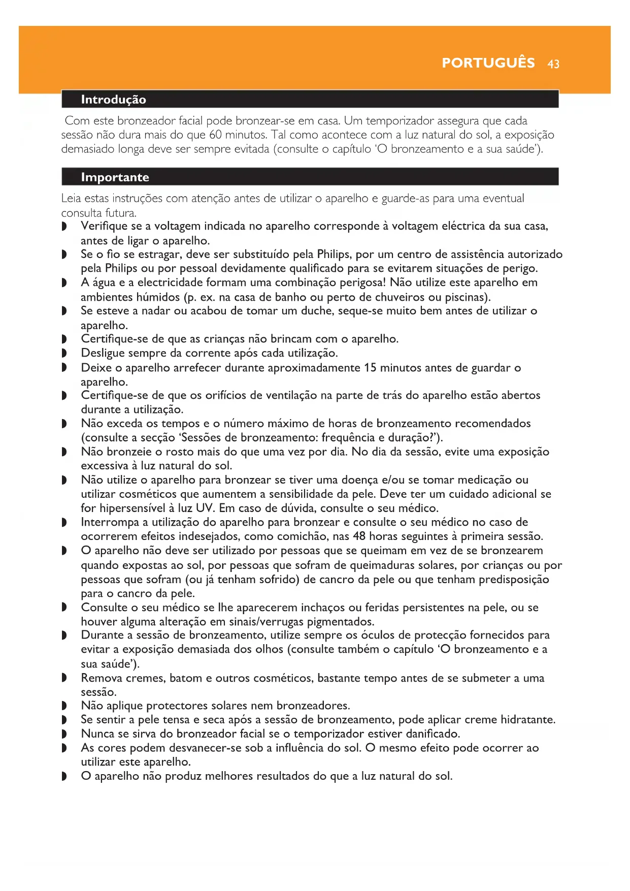 que siga as instruções do capítulo ‘Importante’ e da secção ‘Sessões de bronzeamento: