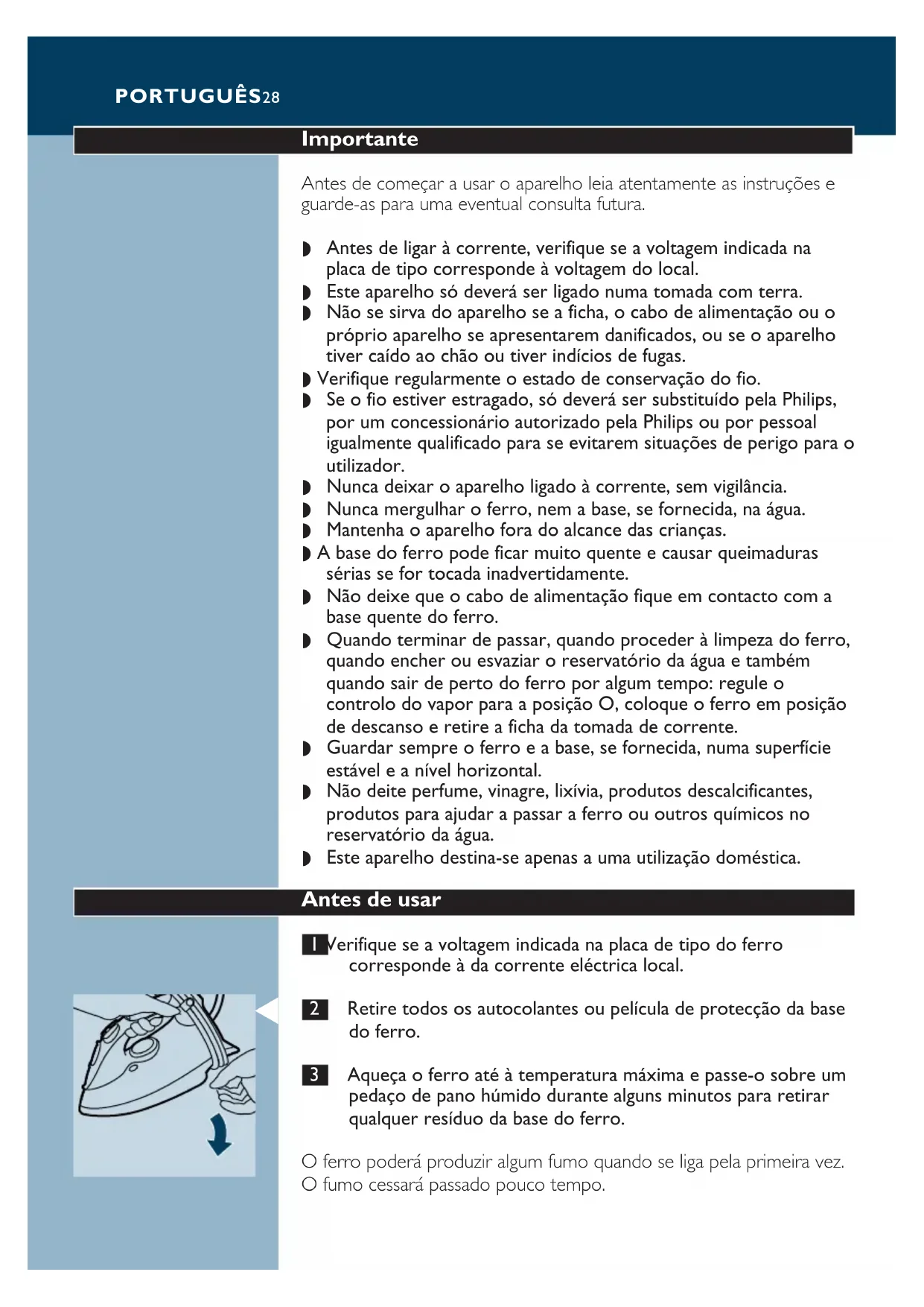 O ferro poderá produzir algum fumo quando se liga pela primeira vez.