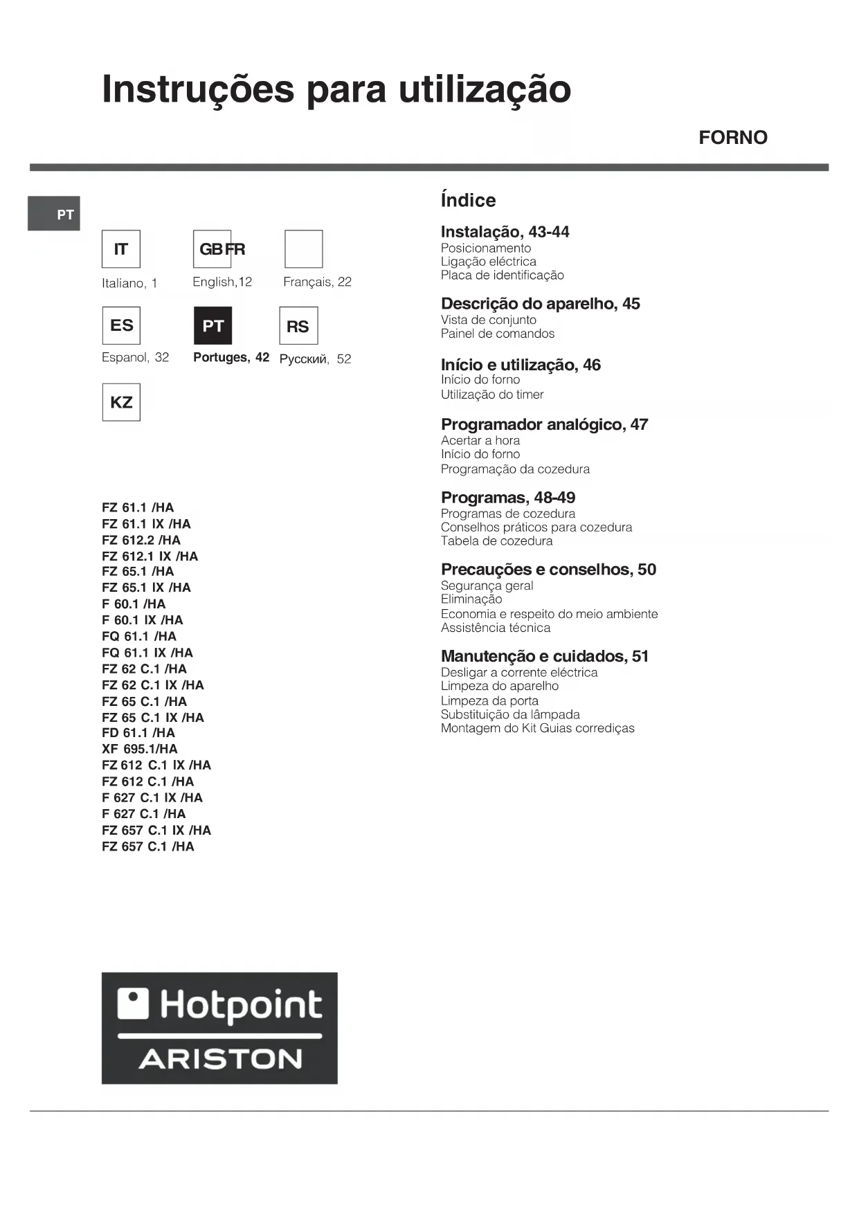 Encontre gratuitamente o manual do aparelho FZ 61.1 IXHA HOTPOINT ARISTON em formato PDF.