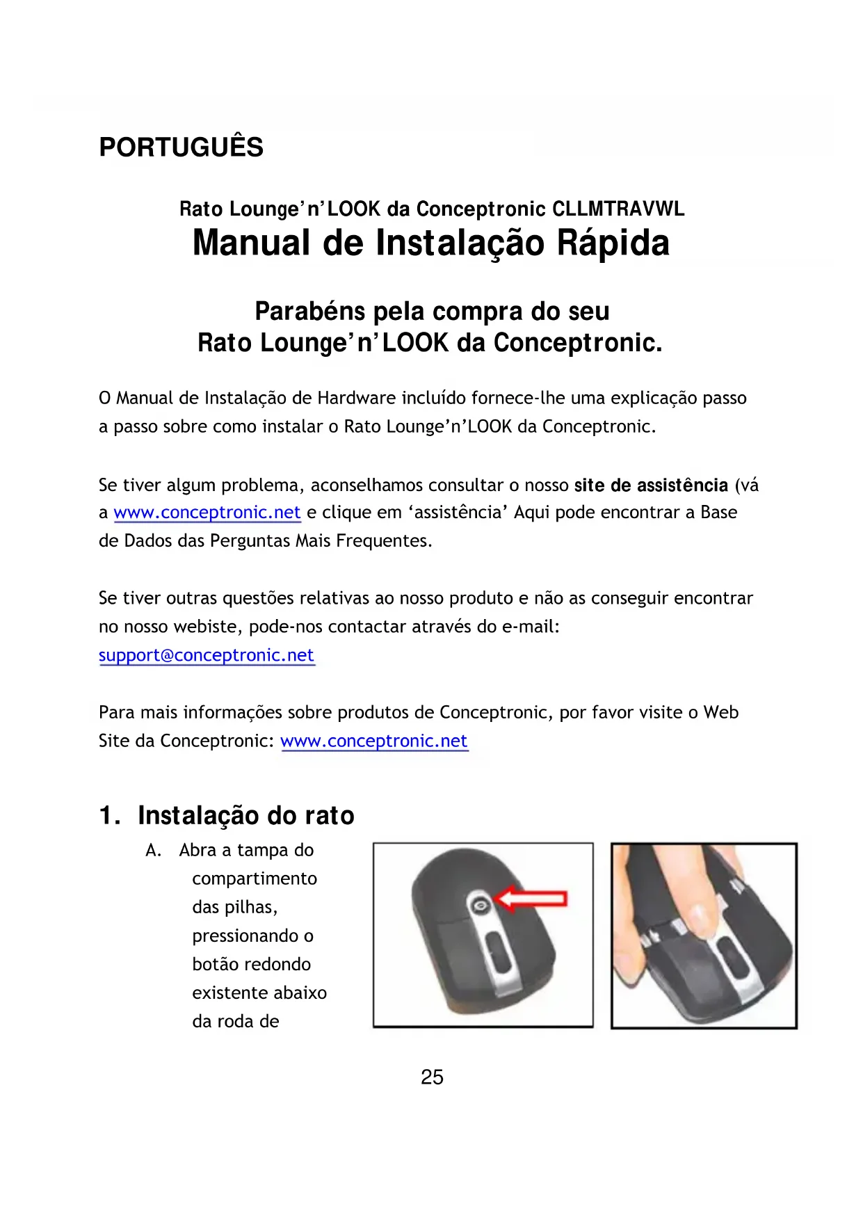 O Manual de Instalação de Hardware incluío fornece-lhe uma explicação passo a passo sobre como instalar o Rato Lounge'n'LOOK da Conceptronic.