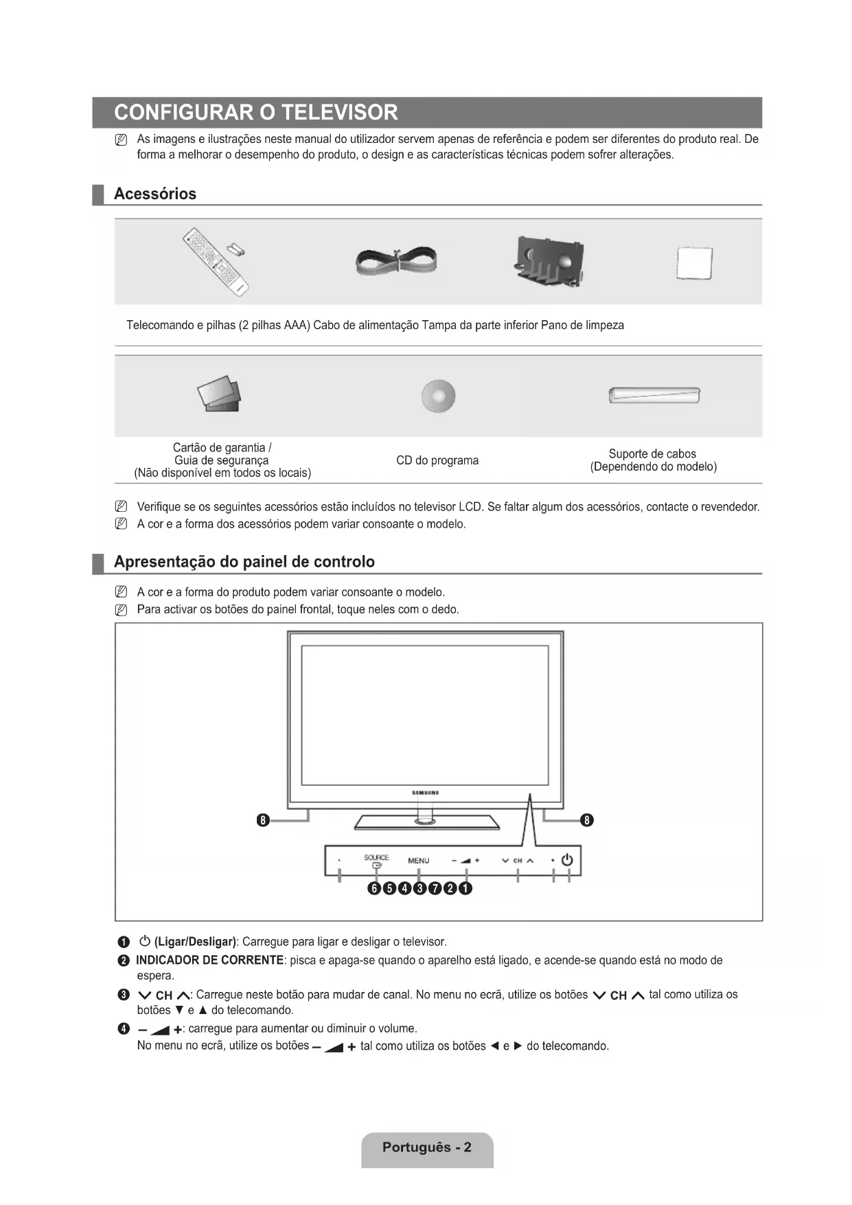 Verifique se os seguintes acessórios estão incluídos no televisor LCD. Se faltar algum dos acessórios, contacte o revendedor.