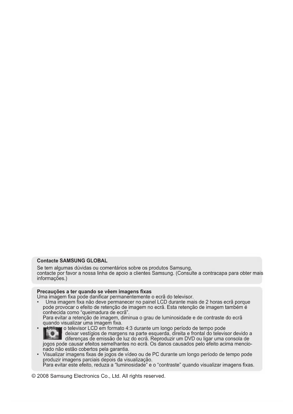 • Uma imagem fixa não deve permanecer no painel LCD durante mais de 2 horas ecrã porque