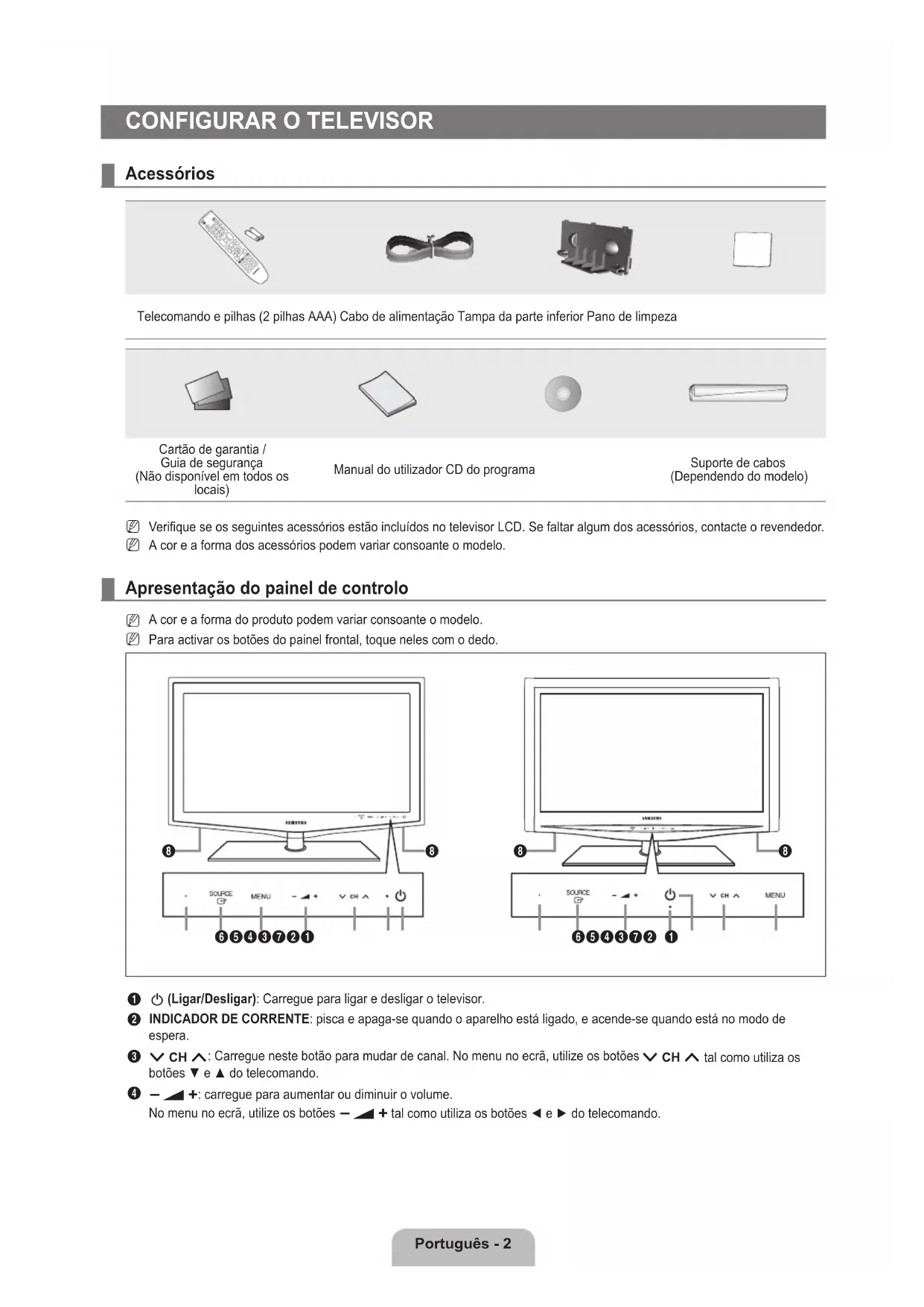 Verifique se os seguintes acessórios estão incluídos no televisor LCD. Se faltar algum dos acessórios, contacte o revendedor.