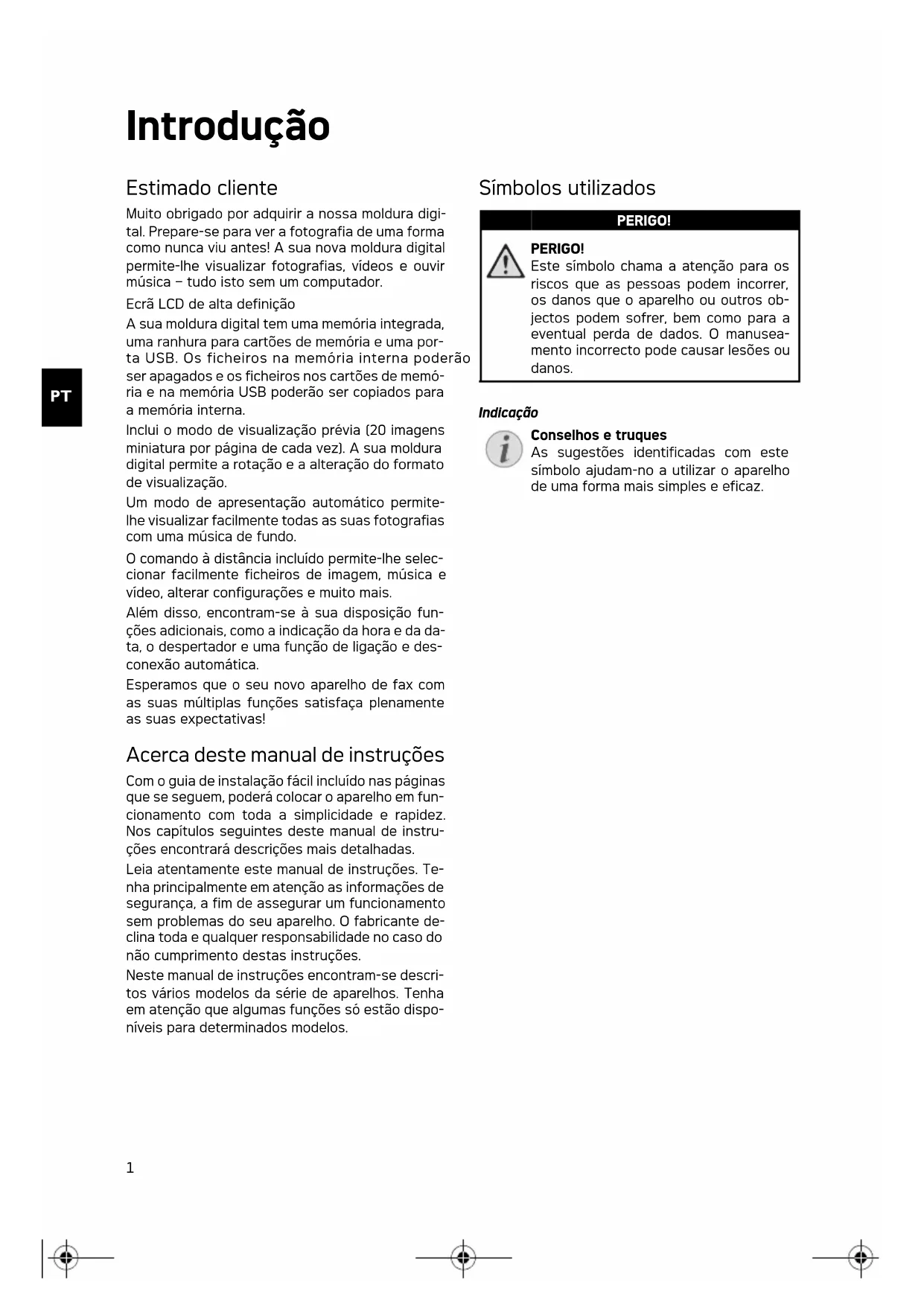 Introdução Estimado cliente Muito obrigado por adquirir a nossa moldura digi- tal. Prepare-se para ver a fotografia de uma forma como nunca viu antes! A sua nova moldura digital permite-lhe visualizar fotografias, vídeos e ouvir música – tudo isto sem um computador. Ecrã LCD de alta definição Memória A sua moldura digital tem uma memória integrada, uma ranhura para cartões de memória e uma por- ta USB. Os ficheiros na memória interna poderão ser apagados e os ficheiros nos cartões de memó- ria e na memória USB poderão ser copiados para a memória interna. Inclui o modo de visualização prévia (20 imagens miniatura por página de cada vez). A sua moldura digital permite a rotação e a alteração do formato de visualização. Um modo de apresentação automático permite- lhe visualizar facilmente todas as suas fotografias com uma música de fundo. O comando à distância incluído permite-lhe selec- cionar facilmente ficheiros de imagem, música e vídeo, alterar configurações e muito mais. Além disso, encontram-se à sua disposição fun- ções adicionais, como a indicação da hora e da da- ta, o despertador e uma função de ligação e des- conexão automática. Esperamos que o seu novo aparelho de fax com as suas múltiplas funções satisfaça plenamente as suas expectativas! Acerca deste manual de instruções Com o guia de instalação fácil incluído nas páginas que se seguem, poderá colocar o aparelho em fun- cionamento com toda a simplicidade e rapidez. Nos capítulos seguintes deste manual de instru- ções encontrará descrições mais detalhadas. Leia atentamente este manual de instruções. Te- nha principalmente em atenção as informações de segurança, a fim de assegurar um funcionamento sem problemas do seu aparelho. O fabricante de- clina toda e qualquer responsabilidade no caso do não cumprimento destas instruções. Neste manual de instruções encontram-se descri- tos vários modelos da série de aparelhos. Tenha em atenção que algumas funções só estão dispo- níveis para determinados modelos. Símbolos utilizados Aviso contra riscos Conselhos e truques PERIGO! PERIGO! Este símbolo chama a atenção para os riscos que as pessoas podem incorrer, os danos que o aparelho ou outros ob- jectos podem sofrer, bem como para a eventual perda de dados. O manusea- mento incorrecto pode causar lesões ou danos. Indicação Conselhos e truques As sugestões identificadas com este símbolo ajudam-no a utilizar o aparelho de uma forma mais simples e eficaz. af-5077_5087_5107psms_manual_07_pt_253243477-a.book Seite 1 Donnerstag, 2. Juli 2009 11:49 112