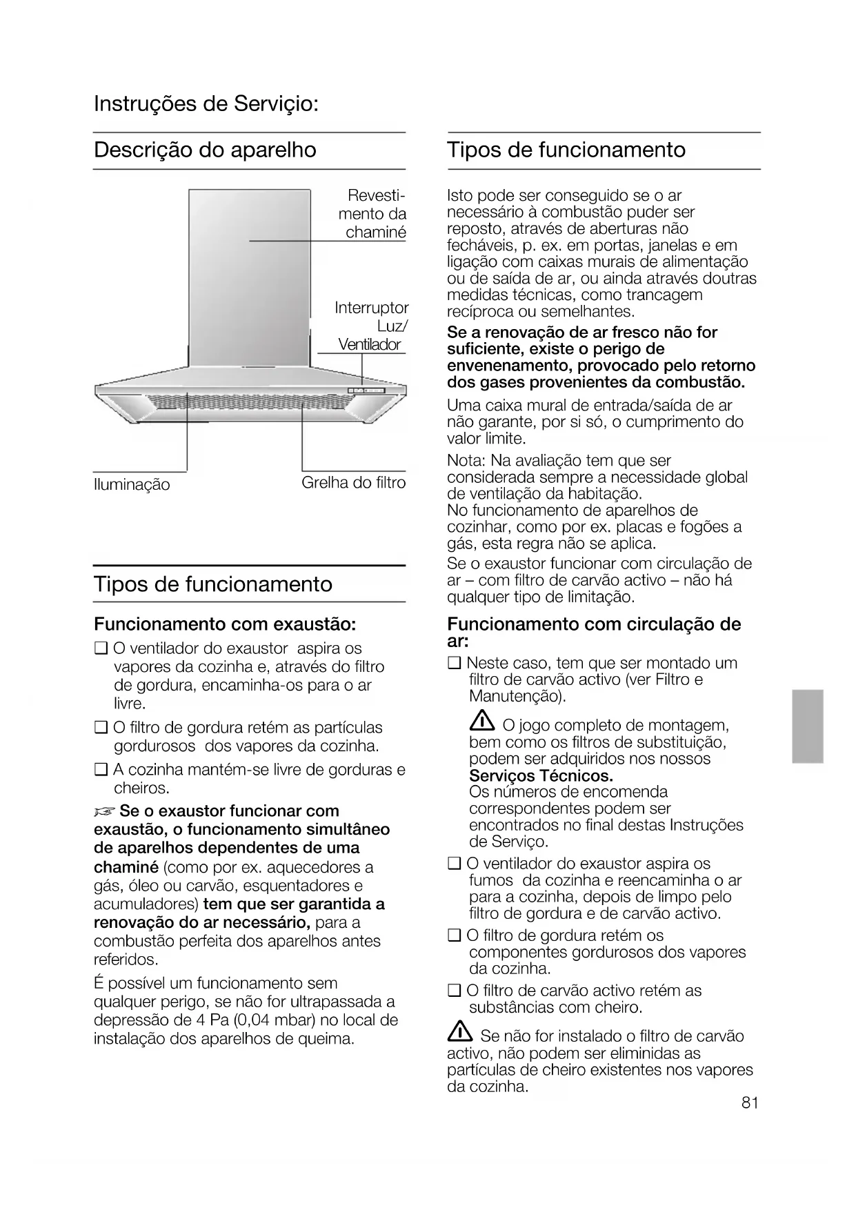 Se o exaustor funcionar com exaustão, o funcionamento simultâneo de aparelhos dependentes de uma chaminé (como por ex. aquecedores a gás, óleo ou carvão, esquentadores e acumuladores) tem que ser garantida a renovação do ar necessário, para a combustão perfeita dos aparelhos antes referidos. É possível um funcionamento sem qualquer perigo, se não for ultrapassada a depressão de 4 Pa (0,04 mbar) no local de instalação dos aparelhos de queima. Tipos de funcionamento Isto pode ser conseguido se o ar necessário à combustão puder ser reposto, através de aberturas não fecháveis, p. ex. em portas, janelas e em ligação com caixas murais de alimentação ou de saída de ar, ou ainda através doutras medidas técnicas, como trancagem recíproca ou semelhantes. Se a renovação de ar fresco não for suficiente, existe o perigo de envenenamento, provocado pelo retorno dos gases provenientes da combustão. Uma caixa mural de entrada/saída de ar não garante, por si só, o cumprimento do valor limite. Nota: Na avaliação tem que ser considerada sempre a necessidade global de ventilação da habitação. No funcionamento de aparelhos de cozinhar, como por ex. placas e fogões a gás, esta regra não se aplica. Se o exaustor funcionar com circulação de ar – com filtro de carvão activo – não há qualquer tipo de limitação. Funcionamento com circulação de ar: ❑ Neste caso, tem que ser montado um filtro de carvão activo (ver Filtro e Manutenção). O jogo completo de montagem, bem como os filtros de substituição, podem ser adquiridos nos nossos Serviços Técnicos. Os números de encomenda correspondentes podem ser encontrados no final destas Instruções de Serviço. ❑ O ventilador do exaustor aspira os fumos da cozinha e reencaminha o ar para a cozinha, depois de limpo pelo filtro de gordura e de carvão activo. ❑ O filtro de gordura retém os componentes gordurosos dos vapores da cozinha. ❑ O filtro de carvão activo retém as substâncias com cheiro. Se não for instalado o filtro de carvão activo, não podem ser eliminidas as partículas de cheiro existentes nos vapores da cozinha.