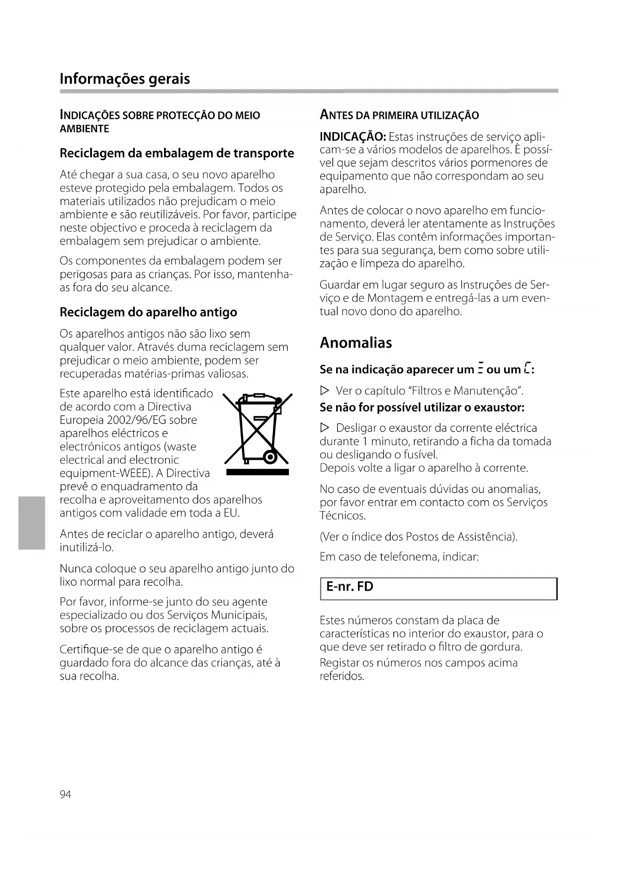 Se na indicação aparecer um # ou um ã: Ver o capítulo “Filtros e Manutenção”.Se não for possível utilizar o exaustor: Desligar o exaustor da corrente eléctricadurante 1 minuto, retirando a ficha da tomadaou desligando o fusível.Depois volte a ligar o aparelho à corrente.No caso de eventuais dúvidas ou anomalias,por favor entrar em contacto com os ServiçosTécnicos. (Ver o índice dos Postos de Assistência). Em caso de telefonema, indicar:Estes números constam da placa de características no interior do exaustor, para oque deve ser retirado o ltro de gordura.Registar os números nos campos acima referidos.95