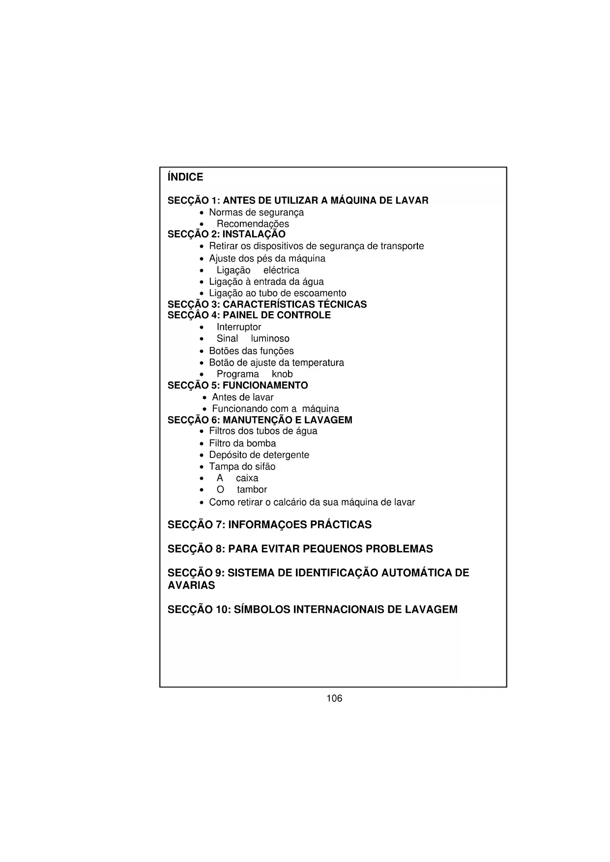 106SECÇÃO 1: ANTES DE UTILIZAR A SUA MÁQUINA DE LAVAR NORMAS DE SEGURANÇA/ADVERTÊNCIAS