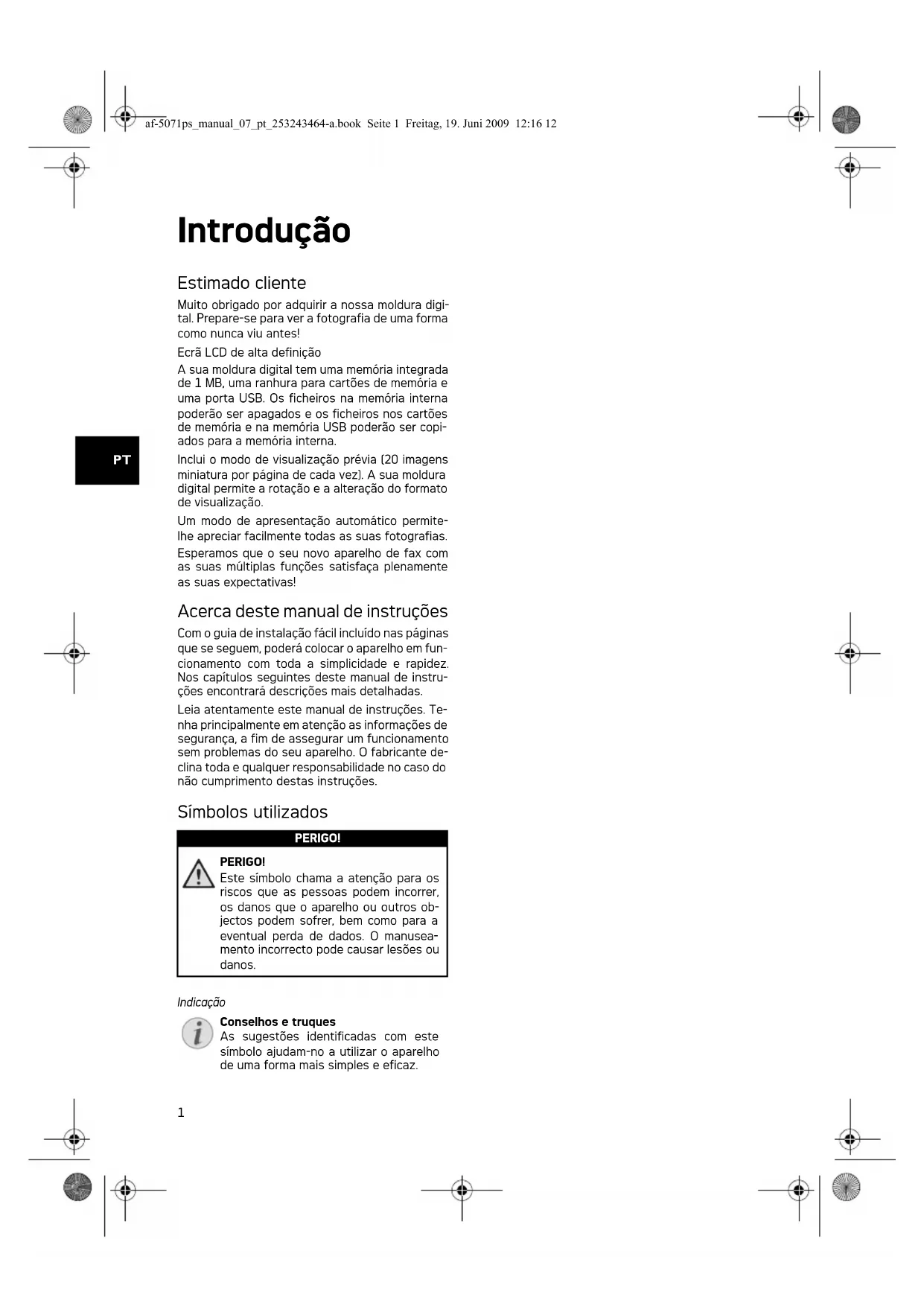 Introdução Estimado cliente Muito obrigado por adquirir a nossa moldura digi- tal. Prepare-se para ver a fotografia de uma forma como nunca viu antes! Ecrã LCD de alta definição Memória A sua moldura digital tem uma memória integrada de 1 MB, uma ranhura para cartões de memória e uma porta USB. Os ficheiros na memória interna poderão ser apagados e os ficheiros nos cartões de memória e na memória USB poderão ser copi- ados para a memória interna. Inclui o modo de visualização prévia (20 imagens miniatura por página de cada vez). A sua moldura digital permite a rotação e a alteração do formato de visualização. Um modo de apresentação automático permite- lhe apreciar facilmente todas as suas fotografias. Esperamos que o seu novo aparelho de fax com as suas múltiplas funções satisfaça plenamente as suas expectativas! Acerca deste manual de instruções Com o guia de instalação fácil incluído nas páginas que se seguem, poderá colocar o aparelho em fun- cionamento com toda a simplicidade e rapidez. Nos capítulos seguintes deste manual de instru- ções encontrará descrições mais detalhadas. Leia atentamente este manual de instruções. Te- nha principalmente em atenção as informações de segurança, a fim de assegurar um funcionamento sem problemas do seu aparelho. O fabricante de- clina toda e qualquer responsabilidade no caso do não cumprimento destas instruções. Símbolos utilizados Aviso contra riscos Conselhos e tru ques PERIGO! PERIGO! Este símbolo chama a atenção para os riscos que as pessoas podem incorrer, os danos que o aparelho ou outros ob- jectos podem sofrer, bem como para a eventual perda de dados. O manusea- mento incorrecto pode causar lesões ou danos. Indicação Conselhos e truques As sugestões identificadas com este símbolo ajudam-no a utilizar o aparelho de uma forma mais simples e eficaz. af-5071ps_manual_07_pt_253243464-a.book Seite 1 Freitag, 19. Juni 2009 12:16 122
