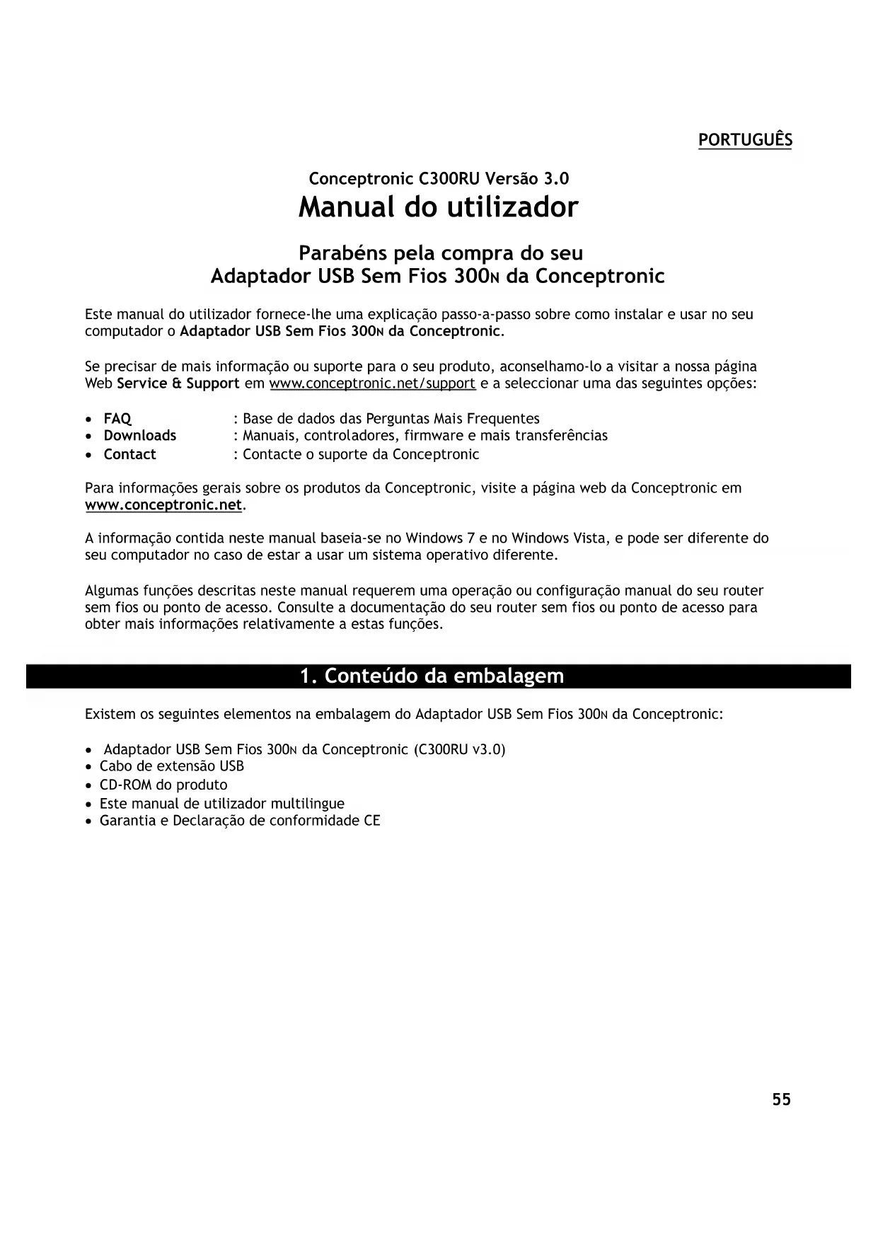 Este manual do utilizes fornece-lhe uma explicacao passo-a-passo sobre como instalar e usar no seu computador o Adaptador USB Sem Fios 300n da Conceptronic.