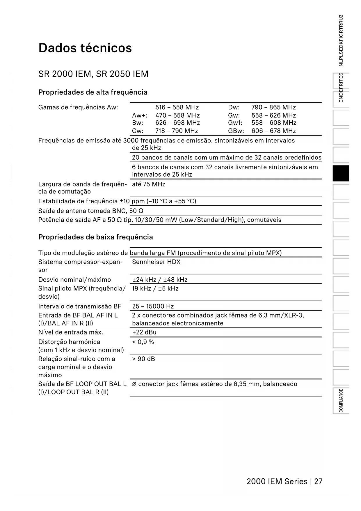 Propriedades de alta frequência Gamas de frequências Aw: Aw+: Bw: Cw: 516 – 558 MHz 470 – 558 MHz 626 – 698 MHz 718 – 790 MHz Dw: Gw: Gw1: GBw: 790 – 865 MHz 558 – 626 MHz 558 – 608 MHz 606 – 678 MHz Frequências de emissão até 3000 frequências de emissão, sintonizáveis em intervalos de 25 kHz 20 bancos de canais com um máximo de 32 canais predefinidos 6 bancos de canais com 32 canais livremente sintonizáveis em intervalos de 25 kHz Largura de banda de frequên- cia de comutação até 75 MHz Estabilidade de frequência ±10 ppm (–10 °C a +55 °C) Saída de antena tomada BNC, 50 Ω Potência de saída AF a 50 Ω tip. 10/30/50 mW (Low/Standard/High), comutáveis Propriedades de baixa frequência Tipo de modulação estéreo de banda larga FM (procedimento de sinal piloto MPX) Sistema compressor-expan- sor Sennheiser HDX Desvio nominal/máximo ±24 kHz / ±48 kHz Sinal piloto MPX (frequência/ desvio) 19 kHz / ±5 kHz Intervalo de transmissão BF 25 – 15000 Hz Entrada de BF BAL AF IN L (I)/BAL AF IN R (II) 2 x conectores combinados jack fêmea de 6,3 mm/XLR-3, balanceados electronicamente Nível de entrada máx. +22 dBu Distorção harmónica (com 1 kHz e desvio nominal) < 0,9 % Relação sinal-ruído com a carga nominal e o desvio máximo > 90 dB Saída de BF LOOP OUT BAL L (I)/LOOP OUT BAL R (II) ⌀ conector jack fêmea estéreo de 6,35 mm, balanceado28 | 2000 IEM Series Aparelho completo SR 2000 SR 2050 Gama de temperaturas –10 °C a +55 °C Alimentação de tensão 100 – 240 V ~ Corrente consumida 0,1 A 0,2 A Dimensões aprox. 217 x 483 x 43 mm Peso (incl. pilhas) aprox. 2500 g aprox. 2700 g Pinagem Áudio Conector jack estéreo macho de 6,3 mm, balanceado (Audio In/Loop out) Conector XLR-3, balanceado (Audio In)