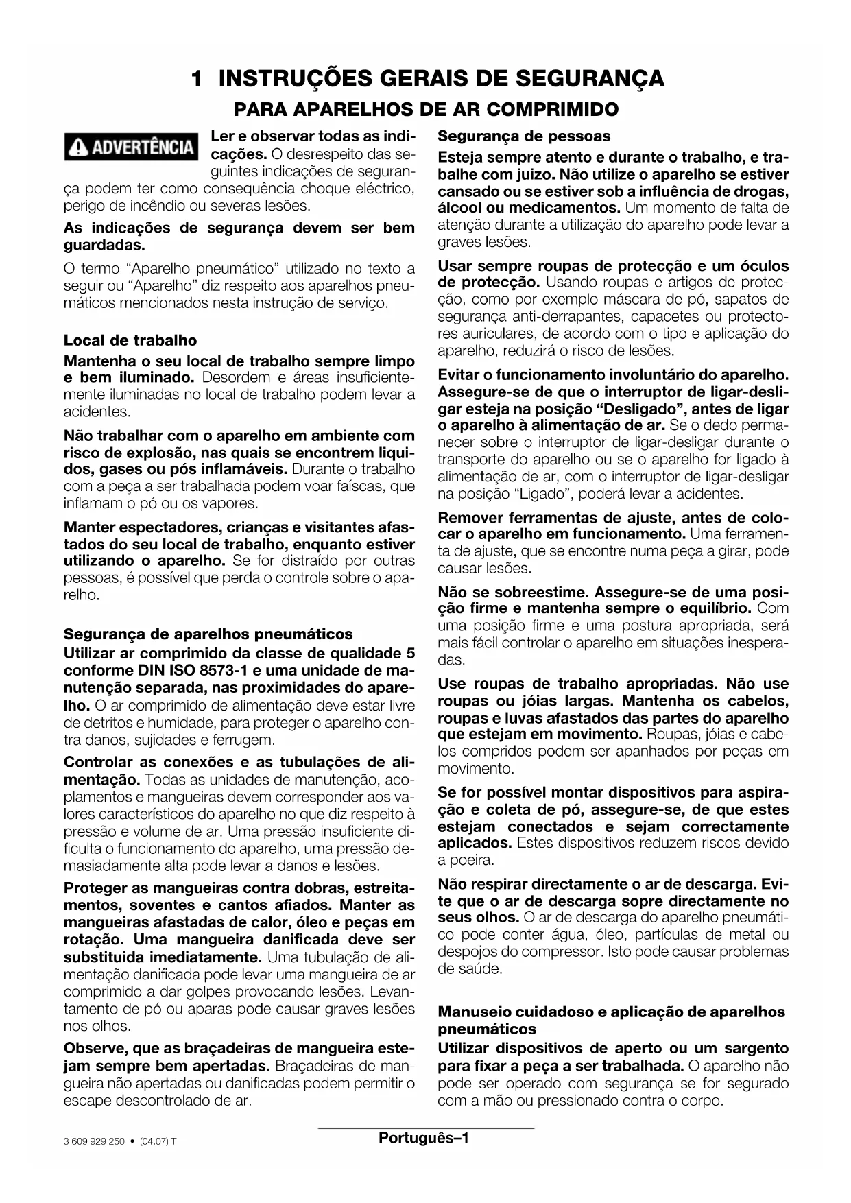 1 INSTRUÇÕES GERAIS DE SEGURANÇA PARA APARELHOS DE AR COMPRIMIDO Ler e observar todas as indi-