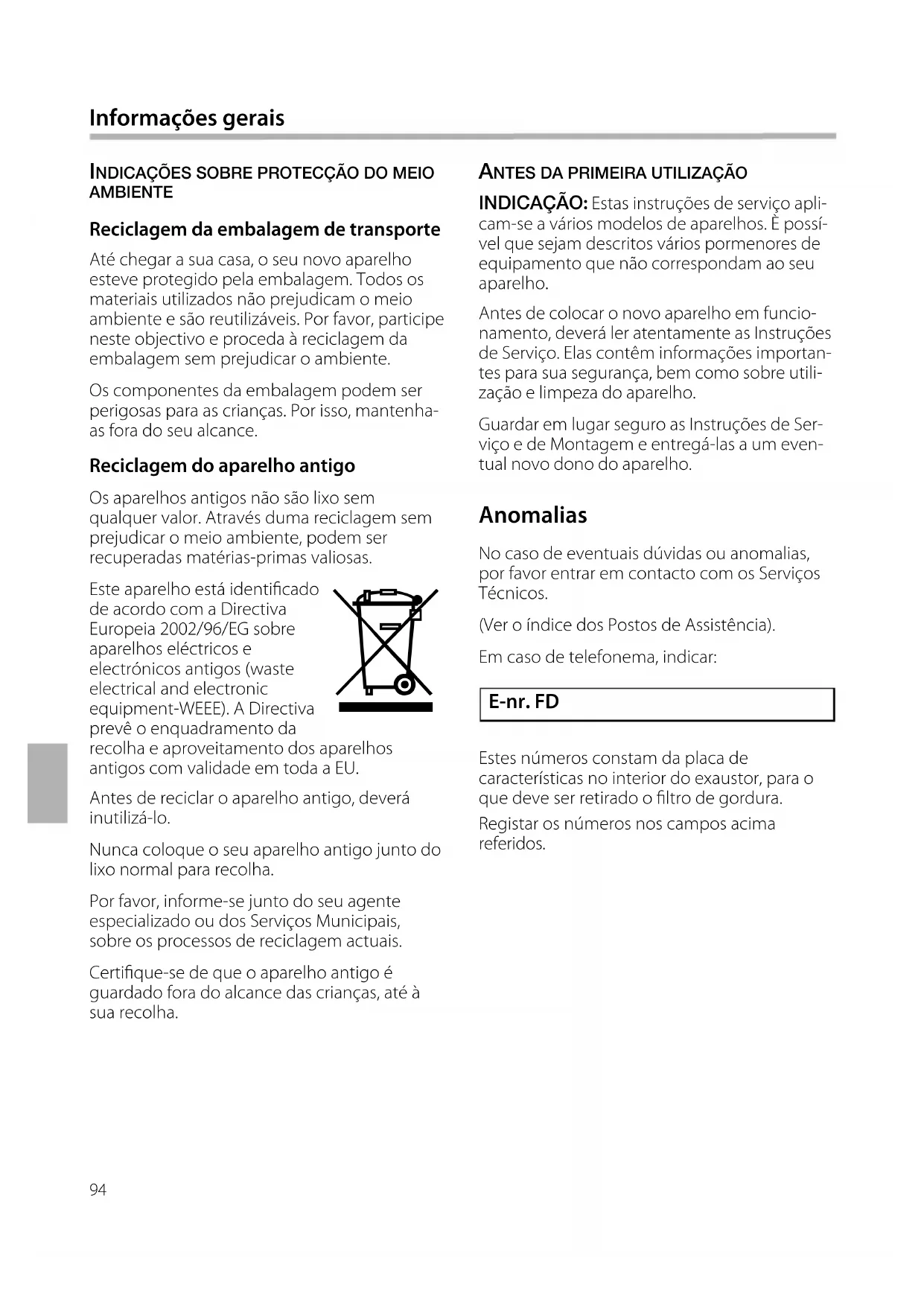 INDICAÇÃO: Estas instruções de serviço apli- cam-se a vários modelos de aparelhos. È possí-vel que sejam descritos vários pormenores deequipamento que não correspondam ao seuaparelho. Antes de colocar o novo aparelho em funcio-namento, deverá ler atentamente as Instruçõesde Serviço. Elas contêm informações importan-tes para sua segurança, bem como sobre utili-zação e limpeza do aparelho.Guardar em lugar seguro as Instruções de Ser-viço e de Montagem e entregá-las a um even-tual novo dono do aparelho. INDICAÇÕES SOBRE PROTECÇÃO DO MEIO AMBIENTE Reciclagem da embalagem de transporte Até chegar a sua casa, o seu novo aparelhoesteve protegido pela embalagem. Todos osmateriais utilizados não prejudicam o meioambiente e são reutilizáveis. Por favor, participeneste objectivo e proceda à reciclagem daembalagem sem prejudicar o ambiente.Os componentes da embalagem podem serperigosas para as crianças. Por isso, mantenha-as fora do seu alcance. Reciclagem do aparelho antigo Os aparelhos antigos não são lixo semqualquer valor. Através duma reciclagem semprejudicar o meio ambiente, podem serrecuperadas matérias-primas valiosas.Este aparelho está identicadode acordo com a DirectivaEuropeia 2002/96/EG sobreaparelhos eléctricos eelectrónicos antigos (wasteelectrical and electronicequipment-WEEE). A Directivaprevê o enquadramento darecolha e aproveitamento dos aparelhosantigos com validade em toda a EU. Antes de reciclar o aparelho antigo, deveráinutilizá-lo. Nunca coloque o seu aparelho antigo junto dolixo normal para recolha.Por favor, informe-se junto do seu agenteespecializado ou dos Serviços Municipais,sobre os processos de reciclagem actuais. Certique-se de que o aparelho antigo éguardado fora do alcance das crianças, até àsua recolha. Anomalias No caso de eventuais dúvidas ou anomalias,por favor entrar em contacto com os ServiçosTécnicos. (Ver o índice dos Postos de Assistência). Em caso de telefonema, indicar:Estes números constam da placa de características no interior do exaustor, para oque deve ser retirado o ltro de gordura.Registar os números nos campos acima referidos. Informações gerais )95 Utilização de acordo com as normas