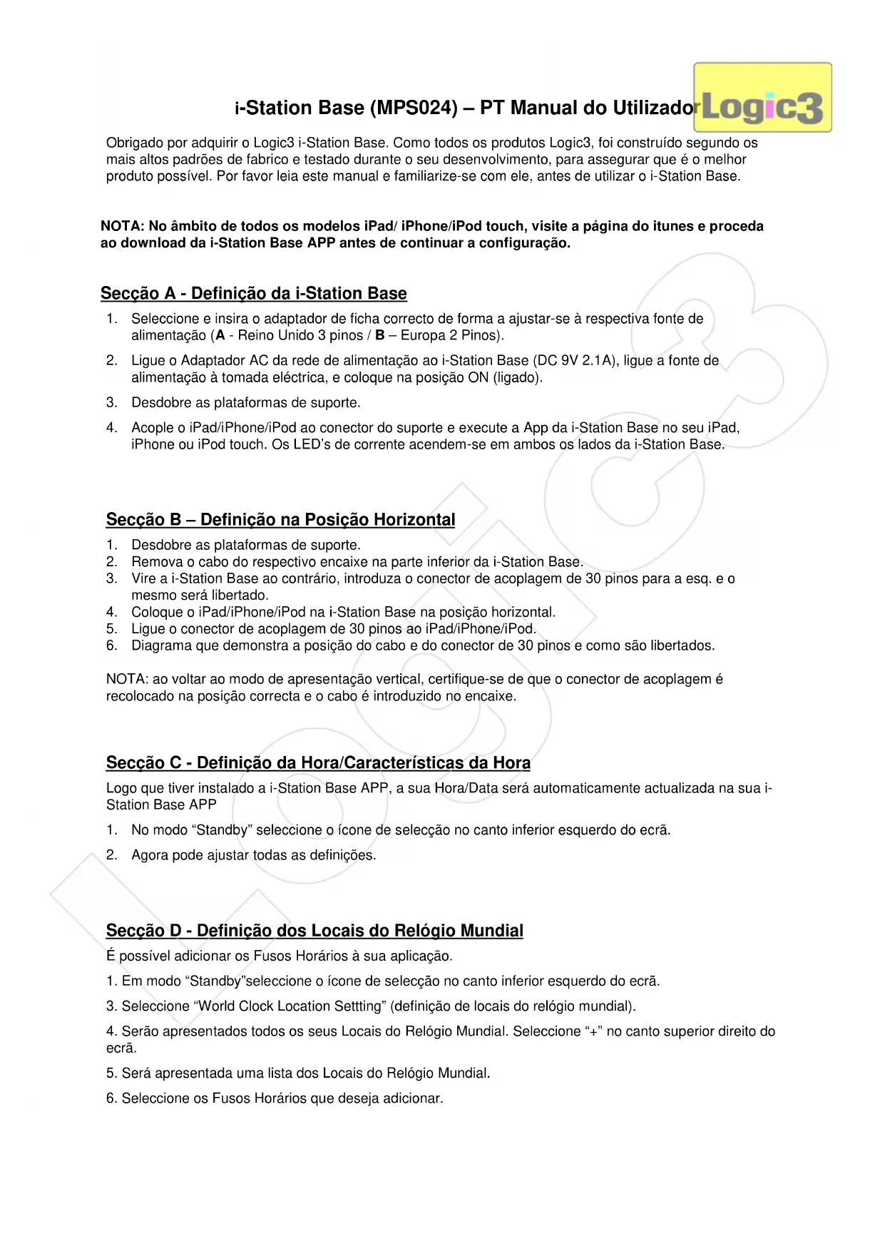 Encontre gratuitamente o manual do aparelho iStation Base Logic3 em formato PDF.