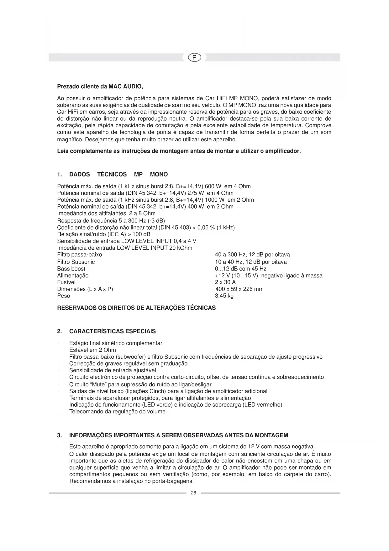 Prezado cliente da MAC AUDIO, Ao possuir o amplificador de potência para sistemas de Car HiFi MP MONO, poderá satisfazer de modo soberano às suas exigências de qualidade de som no seu veículo. O MP MONO traz uma nova qualidade para Car HiFi em carros, seja através da impressionante reserva de potência para os graves, do baixo coeficiente de distorção não linear ou da reprodução neutra. O amplificador destaca-se pela sua baixa corrente de excitação, pela rápida capacidade de comutação e pela excelente estabilidade de temperatura. Comprove como este aparelho de tecnologia de ponta é capaz de transmitir de forma perfeita o prazer de um som magnífico. Desejamos que tenha muito prazer ao utilizar este aparelho. Leia completamente as instruções de montagem antes de montar e utilizar o amplificador.