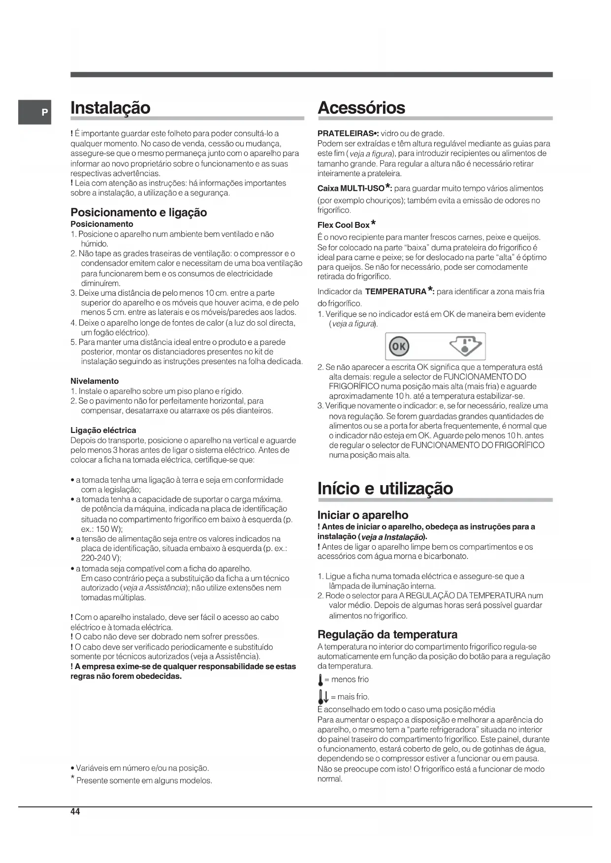 Leia com atenção as instruções: há informações importantessobre a instalação, a utilização e a segurança. Posicionamento e ligação Posicionamento1. Posicione o aparelho num ambiente bem ventilado e nãohúmido.2. Não tape as grades traseiras de ventilação: o compressor e ocondensador emitem calor e necessitam de uma boa ventilaçãopara funcionarem bem e os consumos de electricidadediminuírem.3. Deixe uma distância de pelo menos 10 cm. entre a partesuperior do aparelho e os móveis que houver acima, e de pelomenos 5 cm. entre as laterais e os móveis/paredes aos lados.4. Deixe o aparelho longe de fontes de calor (a luz do sol directa,um fogão eléctrico).5. Para manter uma distância ideal entre o produto e a paredeposterior, montar os distanciadores presentes no kit deinstalação seguindo as instruções presentes na folha dedicada.Nivelamento1. Instale o aparelho sobre um piso plano e rígido.2. Se o pavimento não for perfeitamente horizontal, paracompensar, desatarraxe ou atarraxe os pés dianteiros.Ligação eléctricaDepois do transporte, posicione o aparelho na vertical e aguardepelo menos 3 horas antes de ligar o sistema eléctrico. Antes decolocar a ficha na tomada eléctrica, certifique-se que:• a tomada tenha uma ligação à terra e seja em conformidadecom a legislação;• a tomada tenha a capacidade de suportar o carga máxima.de potência da máquina, indicada na placa de identificaçãosituada no compartimento frigorífico em baixo à esquerda (p.ex.: 150 W);• a tensão de alimentação seja entre os valores indicados naplaca de identificação, situada embaixo à esquerda (p. ex.:220-240 V);• a tomada seja compatível com a ficha do aparelho.Em caso contrário peça a substituição da ficha a um técnicoautorizado (veja a Assistência); não utilize extensões nemtomadas múltiplas.! Com o aparelho instalado, deve ser fácil o acesso ao caboeléctrico e à tomada eléctrica.! O cabo não deve ser dobrado nem sofrer pressões.! O cabo deve ser verificado periodicamente e substituídosomente por técnicos autorizados (veja a Assistência).! A empresa exime-se de qualquer responsabilidade se estasregras não forem obedecidas. Acessórios PRATELEIRAS•: vidro ou de grade.Podem ser extraídas e têm altura regulável mediante as guias paraeste fim (veja a figura), para introduzir recipientes ou alimentos detamanho grande. Para regular a altura não é necessário retirarinteiramente a prateleira.Caixa MULTI-USO * : para guardar muito tempo vários alimentos(por exemplo chouriços); também evita a emissão de odores nofrigorífico.Flex Cool Box * É o novo recipiente para manter frescos carnes, peixe e queijos.Se for colocado na parte “baixa” duma prateleira do frigorífico éideal para carne e peixe; se for deslocado na parte “alta” é óptimopara queijos. Se não for necessário, pode ser comodamenteretirada do frigorífico.Indicador da TEMPERATURA * : para identificar a zona mais friado frigorífico.1. Verifique se no indicador está em OK de maneira bem evidente ( veja a figura ). 2. Se não aparecer a escrita OK significa que a temperatura estáalta demais: regule a selector de FUNCIONAMENTO DOFRIGORÍFICO numa posição mais alta (mais fria) e aguardeaproximadamente 10 h. até a temperatura estabilizar-se.3. Verifique novamente o indicador: e, se for necessário, realize umanova regulação. Se forem guardadas grandes quantidades dealimentos ou se a porta for aberta frequentemente, é normal queo indicador não esteja em OK. Aguarde pelo menos 10 h. antesde regular o selector de FUNCIONAMENTO DO FRIGORÍFICOnuma posição mais alta. Início e utilização
