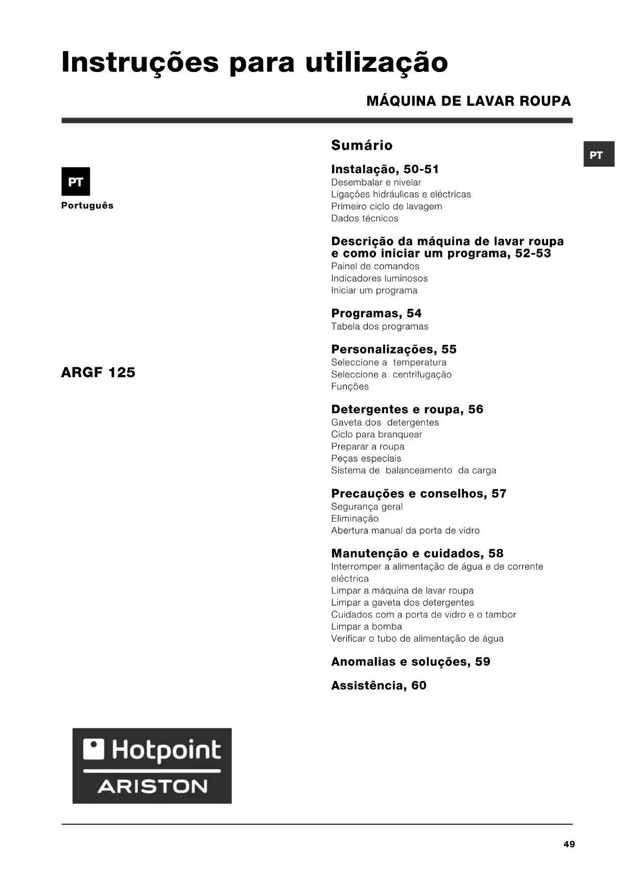 ARGF 125 (EU).R - Máquina de lavar HOTPOINT ARISTON - Manual de utilização gratuito
