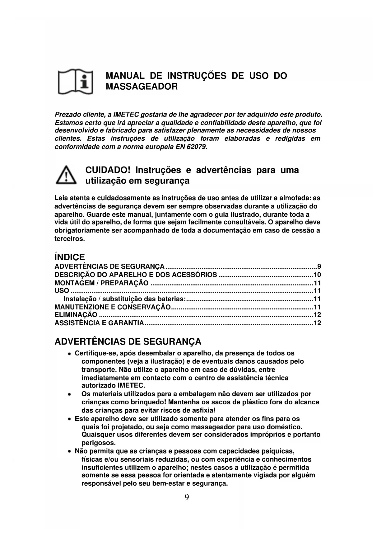 MANUAL DE INSTRUÇÕES DE USO DO MASSAGEADOR Prezado cliente, a IMETEC gostaria de lhe agradecer por ter adquirido este produto.