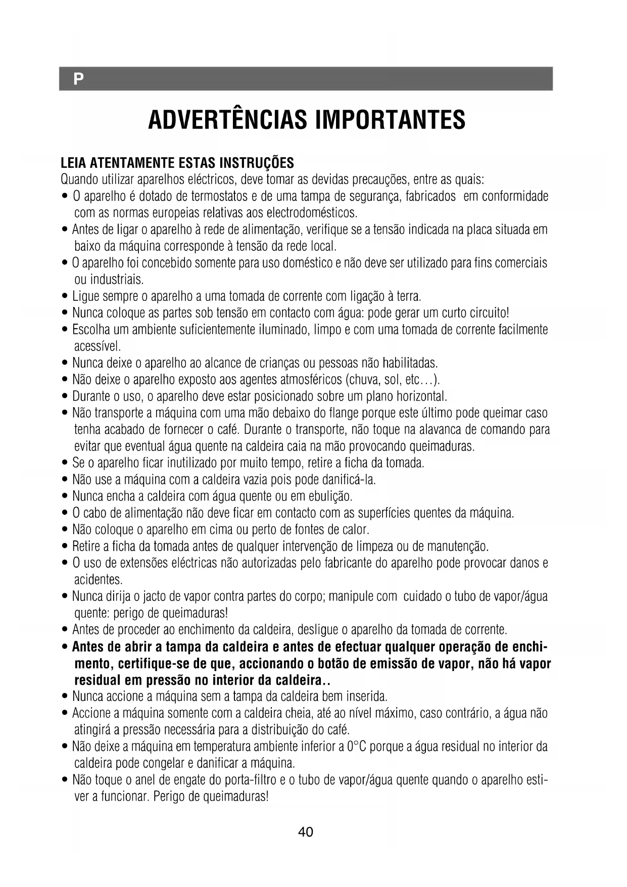P ADVERTÊNCIAS IMPORTANTES LEIA ATENTAMENTE ESTAS INSTRUÇÕES Quando utilizar aparelhos eléctricos, deve tomar as devidas precauções, entre as quais: