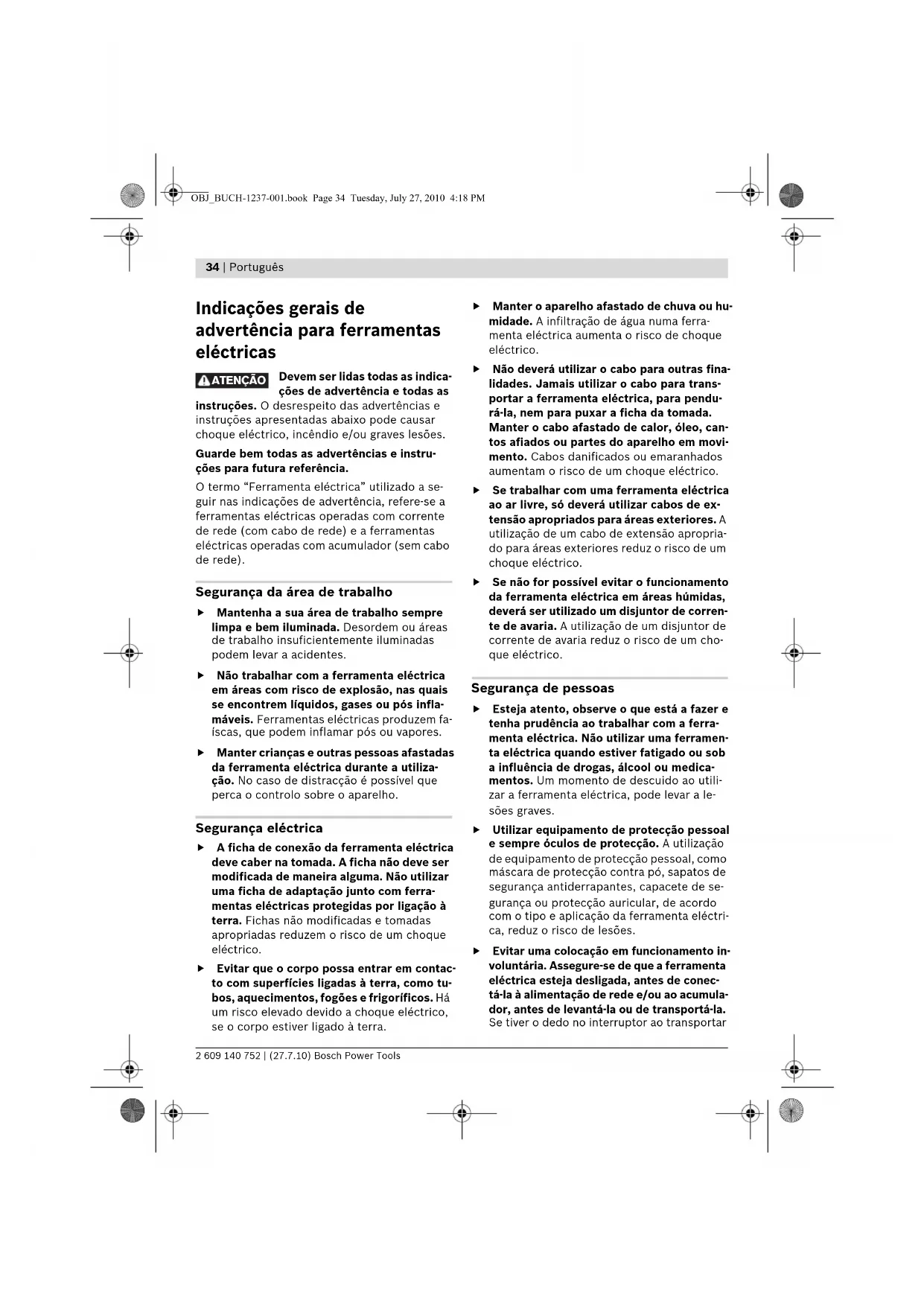 MR P R O D U C T O C E R T I F I C A D O C E R T I F I E D P R O D U C T OBJ_BUCH-1237-001.book Page 33 Tuesday, July 27, 2010 4:18 PM34 | Português 2 609 140 752 | (27.7.10) Bosch Power Tools pt