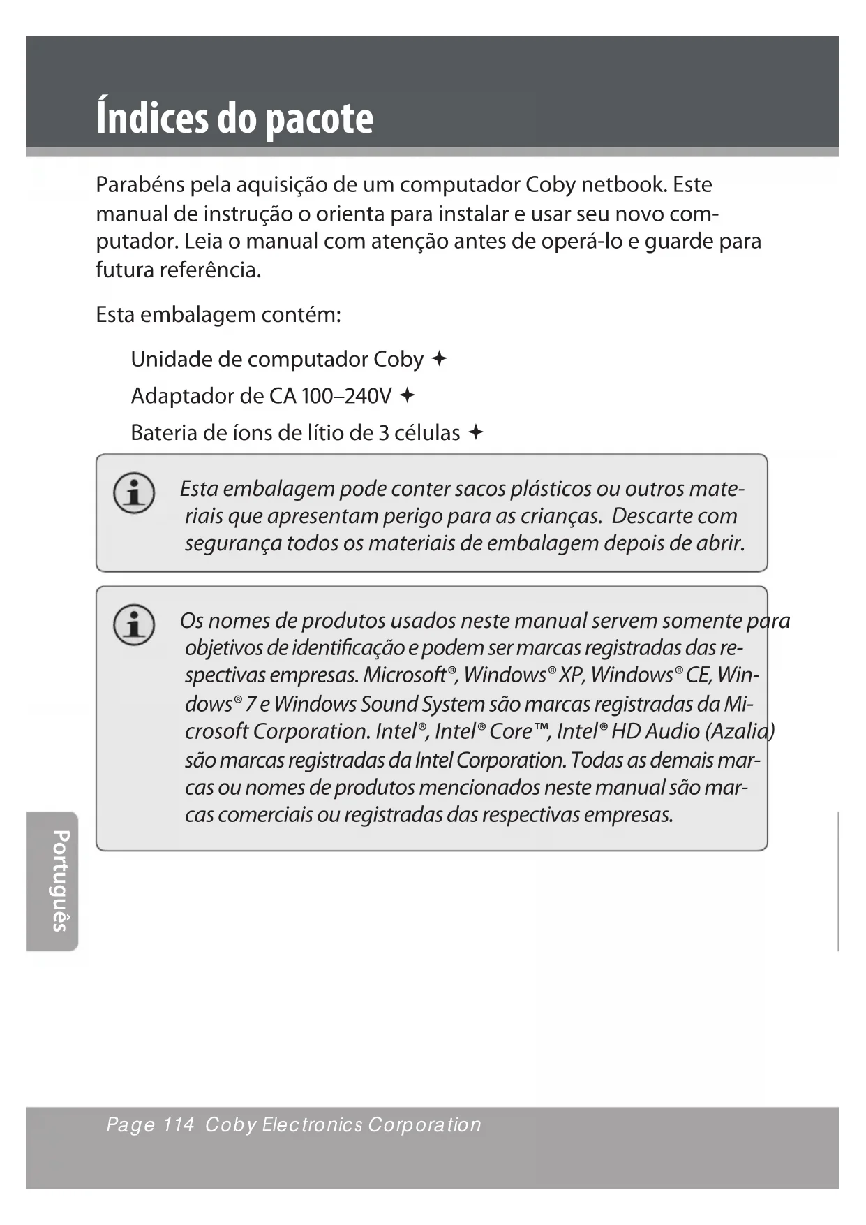 - Zusätzliche Ausstattung Integrierte Web Kamera, 0.3 MP Auösung Eingebautes Mikrofon SD Speicherkartenleser (SDHC kompatibel) Tastatur US-International Batterie 3-Zellen Li-ion (2-3 Stunden Betriebszeit) Eigenschaften können ohne Vorankündigung geändert werden.Page 110 Coby Electronics Corporation www.cobyusa.com Page 111 DeutschPage 112 Coby Electronics Corporation Português www.cobyusa.com Page 113 Índice íNDiCES DO PaCOTE p. 112