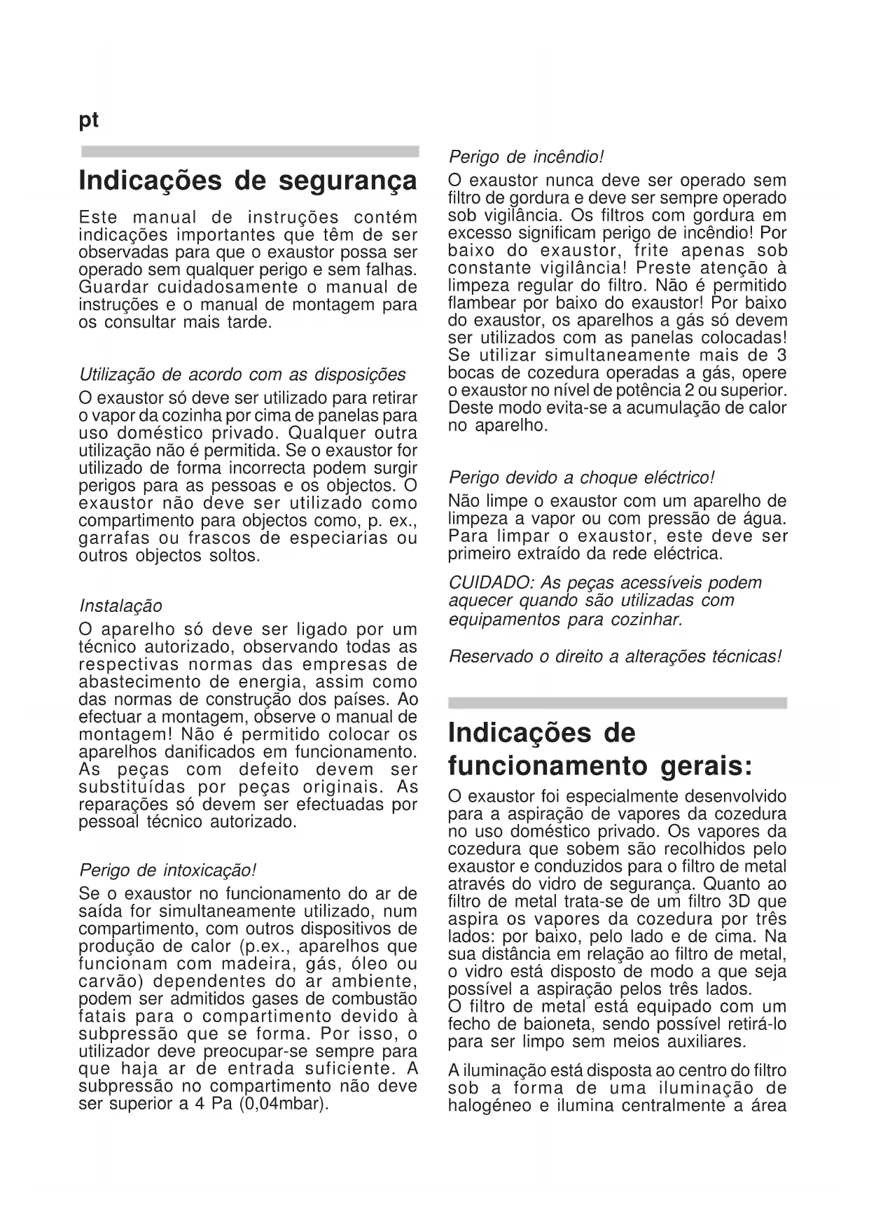 ðóñÄëÿ çàìåíû ëàìïû (ëàìïà íàêàëèâàíèÿ, âêëþ÷àÿ îòðàæàòåëü) ñíà÷àëà âûíóòü èç âûòÿæêè ñòîïîðíîå êîëüöî (ñ) ïðè ïîìîùè îòâåðòêè. Çàòåì îòñîåäèíèòü îò ëàìïû (à) øòåêåð è îòñîåäèíèòü åå îò êðåïëåíèÿ. Äëÿ ýòîãî ñæàòü ïðóæèííîå êîëüöî (b) è ñíÿòü åãî äâèæåíèåì ââåðõ. Óñòàíîâêà íîâîé ëàìïû îñóùåñòâëÿåòñÿ â îáðàòíîé ïîñëåäîâàòåëüíîñòè. Íåèñïðàâíîñòè Íåìåäëåííî îáðàòèòüñÿ â íàøó ñëóæáó ñåðâèñà, åñëè: - âûòÿæêà èçäàåò íåõàðàêòåðíûå øóìû è åñëè ïîñëå ïðîâåðêè âûòÿæíîãî êàíàëà íå óäàëîñü óñòàíîâèòü äåôåêòû; - áûëî óñòàíîâëåíî, ÷òî ìîòîð âûòÿæêè íåèñïðàâåí, íàïðèìåð, ïîñðåäñòâîì îïðåäåëåíèÿ íåõàðàêòåðíûõ øóìîâ; - óñòðîéñòâî ïåðåêëþ÷åíèÿ íå ðàáîòàåò íàäëåæàùèì îáðàçîì. Îáÿçàòåëüíî óêàçàòü îáîçíà÷åíèå òèïà Âàøåé âûòÿæêè è ñîîòâåòñòâóþùèé ñåðèéíûé íîìåð. Ýòè ñâåäåíèÿ óêàçàíû íà ôèðìåííîé òàáëè÷êå. Òàáëè÷êà íàõîäèòñÿ â çîíå ðàñïîëîæåíèÿ ôèëüòðîâ âíóòðè âûòÿæêè. Óòèëèçàöèÿ Óïàêîâêà Óïàêîâêà ïðèáîðà ìîæåò áûòü ïåðåðàáîòàíà è èñïîëüçîâàíà âòîðè÷íî.  êà÷åñòâå óïàêîâî÷íîãî ìàòåðèàëà èñïîëüçóþòñÿ êàðòîí è ïîëèýòèëåíîâàÿ ïëåíêà. Ýòè ìàòåðèàëû íåîáõîäèìî óòèëèçèðîâàòü ýêîëîãè÷åñêè áåçîïàñíûì è ñîîòâåòñòâóþùèì ìåñòíûì äåéñòâóþùèì ïðåäïèñàíèÿì ñïîñîáîì. Âûòÿæêà  ìóíèöèïàëèòåòå ìîæíî ïîëó÷èòü ñâåäåíèÿ îá ýêîëîãè÷åñêè áåçîïàñíîé óòèëèçàöèè áûòîâûõ ïðèáîðîâ ñ èñòåêøèì ñðîêîì ñëóæáû. Óêàçàíèÿ ïî îõðàíå îêðóæàþùåé ñðåäû Ïðèáîð ìàðêèðîâàí â ñîîòâåòñòâèè ñ åâðîïåéñêîé äèðåêòèâîé 2002/96/EG îá îòõîäàõ ýëåêòðè÷åñêîãî è ýëåêòðîííîãî îáîðóäîâàíèÿ. Äèðåêòèâà îïðåäåëÿåò îáùèå ïðèìåíèìûå âî âñåõ ñòðàíàõ ÅÑ óñëîâèÿ âîçâðàòà è ïåðåðàáîòêè îáîðóäîâàíèÿ ñ èñòåêøèì ñðîêîì ñëóæáû. Ñâåäåíèÿ î ñîâðåìåííûõ ñïîñîáàõ óòèëèçàöèè ìîæíî ïîëó÷èòü ó äèëåðà. Òåõíè÷åñêèå õàðàêòåðèñòèêè Ïîäêëþ÷åíèå ê ñåòè: 220-240  / 50 -60Ãö, ìàêñ. 160 Âò, â âèäå îïöèè 300 Âò Îñâåùåíèå: ãàëîãåííàÿ ëàìïà õîëîäíîãî ñâåòà 12  35 Âò Öîêîëü MR16 ðóñpt Indicações de segurança Este manual de instruções contém indicações importantes que têm de ser observadas para que o exaustor possa ser operado sem qualquer perigo e sem falhas. Guardar cuidadosamente o manual de instruções e o manual de montagem para os consultar mais tarde. Utilização de acordo com as disposições O exaustor só deve ser utilizado para retirar o vapor da cozinha por cima de panelas para uso doméstico privado. Qualquer outra utilização não é permitida. Se o exaustor for utilizado de forma incorrecta podem surgir perigos para as pessoas e os objectos. O exaustor não deve ser utilizado como compartimento para objectos como, p. ex., garrafas ou frascos de especiarias ou outros objectos soltos. Instalação O aparelho só deve ser ligado por um técnico autorizado, observando todas as respectivas normas das empresas de abastecimento de energia, assim como das normas de construção dos países. Ao efectuar a montagem, observe o manual de montagem! Não é permitido colocar os aparelhos danificados em funcionamento. As peças com defeito devem ser substituídas por peças originais. As reparações só devem ser efectuadas por pessoal técnico autorizado. Perigo de intoxicação! Se o exaustor no funcionamento do ar de saída for simultaneamente utilizado, num compartimento, com outros dispositivos de produção de calor (p.ex., aparelhos que funcionam com madeira, gás, óleo ou carvão) dependentes do ar ambiente, podem ser admitidos gases de combustão fatais para o compartimento devido à subpressão que se forma. Por isso, o utilizador deve preocupar-se sempre para que haja ar de entrada suficiente. A subpressão no compartimento não deve ser superior a 4 Pa (0,04mbar). Perigo de incêndio! O exaustor nunca deve ser operado sem filtro de gordura e deve ser sempre operado sob vigilância. Os filtros com gordura em excesso significam perigo de incêndio! Por baixo do exaustor, frite apenas sob constante vigilância! Preste atenção à limpeza regular do filtro. Não é permitido flambear por baixo do exaustor! Por baixo do exaustor, os aparelhos a gás só devem ser utilizados com as panelas colocadas! Se utilizar simultaneamente mais de 3 bocas de cozedura operadas a gás, opere o exaustor no nível de potência 2 ou superior. Deste modo evita-se a acumulação de calor no aparelho. Perigo devido a choque eléctrico! Não limpe o exaustor com um aparelho de limpeza a vapor ou com pressão de água. Para limpar o exaustor, este deve ser primeiro extraído da rede eléctrica. CUIDADO: As peças acessíveis podem aquecer quando são utilizadas com equipamentos para cozinhar. Reservado o direito a alterações técnica