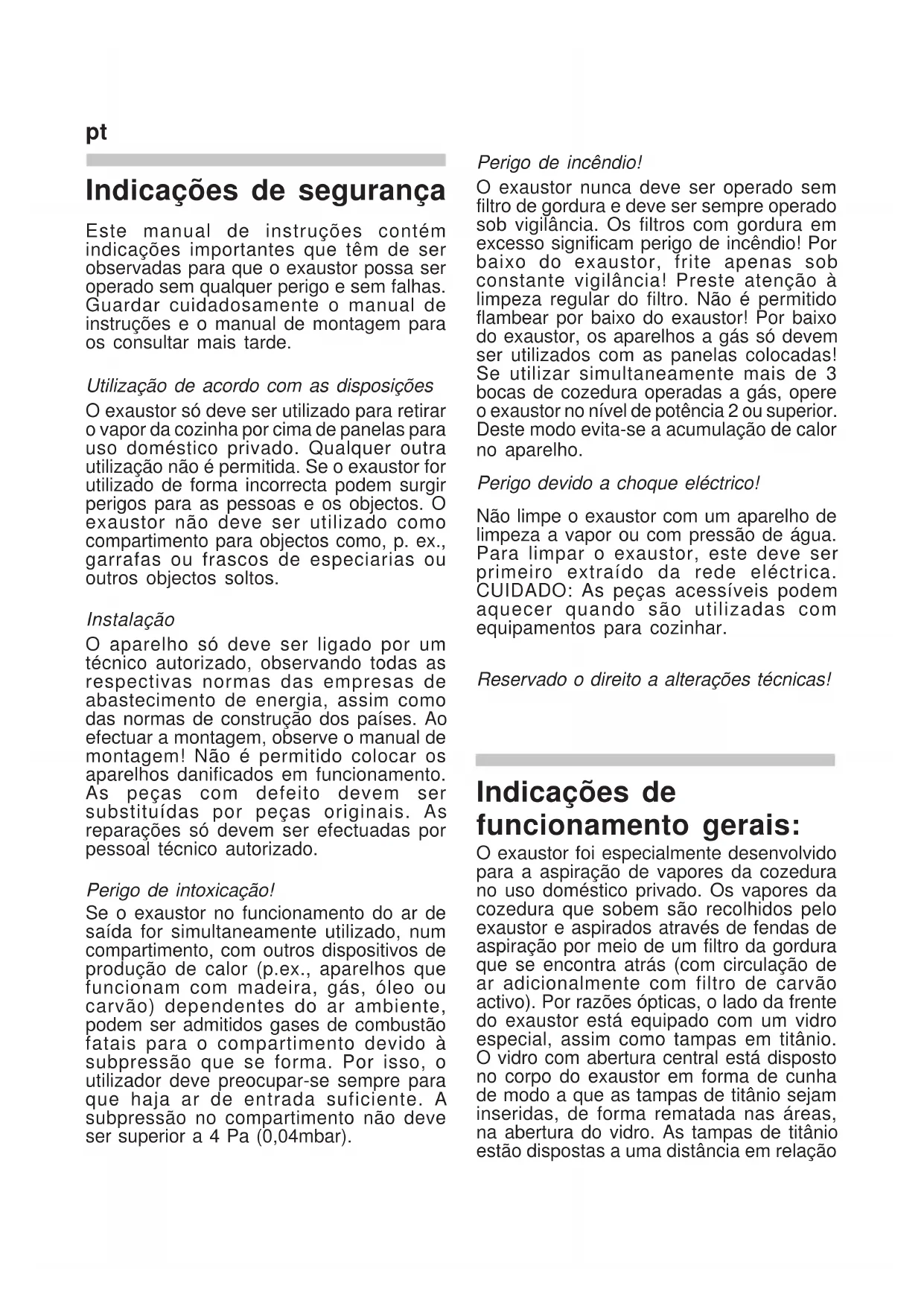 Çàìåíà ëàìïû Îòñîåäèíèòü âûòÿæêó îò ñåòè! Äëÿ çàìåíû ãàëîãåííûõ ëàì ïðè ïîìîùè ìàëåíüêîé îòâåðòêè îñòîðîæíî ñíÿòü ñòåêëÿííóþ êðûøêó, âûíóòü ëàìïû è çàìåíèò íîâûìè. Èçáåãàòü íåïîñðåäñòâåííîãî êîíòàêòà ìåæäó ëàìïîé è ïàëüöàìè. Íåèñïðàâíûå ëàìïû íåçàìåäëèòåëüíî çàìåíÿòü íîâûìè. pycÍåèñïðàâíîñòè Íåìåäëåííî îáðàòèòüñÿ â íàøó ñëóæáó ñåðâèñà, åñëè: -âûòÿæêà èçäàåò íåõàðàêòåðíûå øóìû è åñëè ïîñëå ïðîâåðêè âûòÿæíîãî êàíàëà íå óäàëîñü óñòàíîâèòü äåôåêòû; -áûëî óñòàíîâëåíî, ÷òî ìîòîð âûòÿæêè íåèñïðàâåí, íàïðèìåð, ïîñðåäñòâîì îïðåäåëåíèÿ íåõàðàêòåðíûõ øóìîâ; -óñòðîéñòâî ïåðåêëþ÷åíèÿ íå ðàáîòàåò íàäëåæàùèì îáðàçîì. Îáÿçàòåëüíî óêàçàòü îáîçíà÷åíèå òèïà Âàøåé âûòÿæêè è ñîîòâåòñòâóþùèé ñåðèéíûé íîìåð. Ýòè ñâåäåíèÿ óêàçàíû íà ôèðìåííîé òàáëè÷êå. Òàáëè÷êà íàõîäèòñÿ â çîíå ðàñïîëîæåíèÿ ôèëüòðîâ âíóòðè âûòÿæêè. Óäàëåíèå îòõîäîâ Óïàêîâêà Óïàêîâêà ïðèáîðà ìîæåò áûòü ïåðåðàáîòàíà è èñïîëüçîâàíà âòîðè÷íî.  êà÷åñòâå óïàêîâî÷íîãî ìàòåðèàëà èñïîëüçóþòñÿ êàðòîí è ïîëèýòèëåíîâàÿ ïëåíêà. Ýòè ìàòåðèàëû íåîáõîäèìî óòèëèçèðîâàòü ýêîëîãè÷åñêè áåçîïàñíûì è ñîîòâåòñòâóþùèì ìåñòíûì äåéñòâóþùèì ïðåäïèñàíèÿì ñïîñîáîì. Âûòÿæêà  ìóíèöèïàëèòåòå ìîæíî ïîëó÷èòü ñâåäåíèÿ îá ýêîëîãè÷åñêè áåçîïàñíîé óòèëèçàöèè áûòîâûõ ïðèáîðîâ ñ èñòåêøèì ñðîêîì ñëóæáû. Óêàçàíèÿ ïî îõðàíå îêðóæàþùåé ñðåäû Ýòîò ïðèáîð ïðîìàðêèðîâàí â ñîîòâåòñòâèè ñ åâðîïåéñêîé äèðåêòèâîé 2002/96/EG îá îòõîäàõ ýëåêòðè÷åñêîãî è ýëåêòðîííîãî îáîðóäîâàíèÿ. Äèðåêòèâà îïðåäåëÿåò îáùèå äåéñòâóþùèå âî âñåõ ñòðàíàõ ÅÑ óñëîâèÿ âîçâðàòà è ïåðåðàáîòêè îáîðóäîâàíèÿ ñ èñòåêøèì ñðîêîì ñëóæáû. Ñâåäåíèÿ î ñîâðåìåííûõ ñïîñîáàõ óòèëèçàöèè ìîæíî ïîëó÷èòü ó äèëåðà. Òåõíè÷åñêèå õàðàêòåðèñòèêè Ïîäêëþ÷åíèå ê ñåòè: 220-240  / 50-60 Ãö, ìàêñ. 300 Âò Îñâåùåíèå: ãàëîãåííàÿ ëàìïà õîëîäíîãî ñâåòà 12  20 Âò Öîêîëü G/4 21520 pycpt Indicações de segurança Este manual de instruções contém indicações importantes que têm de ser observadas para que o exaustor possa ser operado sem qualquer perigo e sem falhas. Guardar cuidadosamente o manual de instruções e o manual de montagem para os consultar mais tarde. Utilização de acordo com as disposições O exaustor só deve ser utilizado para retirar o vapor da cozinha por cima de panelas para uso doméstico privado. Qualquer outra utilização não é permitida. Se o exaustor for utilizado de forma incorrecta podem surgir perigos para as pessoas e os objectos. O exaustor não deve ser utilizado como compartimento para objectos como, p. ex., garrafas ou frascos de especiarias ou outros objectos soltos. Instalação O aparelho só deve ser ligado por um técnico autorizado, observando todas as respectivas normas das empresas de abastecimento de energia, assim como das normas de construção dos países. Ao efectuar a montagem, observe o manual de montagem! Não é permitido colocar os aparelhos danificados em funcionamento. As peças com defeito devem ser substituídas por peças originais. As reparações só devem ser efectuadas por pessoal técnico autorizado. Perigo de intoxicação! Se o exaustor no funcionamento do ar de saída for simultaneamente utilizado, num compartimento, com outros dispositivos de produção de calor (p.ex., aparelhos que funcionam com madeira, gás, óleo ou carvão) dependentes do ar ambiente, podem ser admitidos gases de combustão fatais para o compartimento devido à subpressão que se forma. Por isso, o utilizador deve preocupar-se sempre para que haja ar de entrada suficiente. A subpressão no compartimento não deve ser superior a 4 Pa (0,04mbar). Perigo de incêndio! O exaustor nunca deve ser operado sem filtro de gordura e deve ser sempre operado sob vigilância. Os filtros com gordura em excesso significam perigo de incêndio! Por baixo do exaustor, frite apenas sob constante vigilância! Preste atenção à limpeza regular do filtro. Não é permitido flambear por baixo do exaustor! Por baixo do exaustor, os aparelhos a gás só devem ser utilizados com as panelas colocadas! Se utilizar simultaneamente mais de 3 bocas de cozedura operadas a gás, opere o exaustor no nível de potência 2 ou superior. Deste modo evita-se a acumulação de calor no aparelho. Perigo devido a choque eléctrico! Não limpe o exaustor com um aparelho de limpeza a vapor ou com pressão de água. Para limpar o exaustor, este deve ser primeiro extraído da rede eléctrica. CUIDADO: As peças acessíveis podem aquecer quando são utilizadas com equipamentos para cozinhar. Reservado o direito a alterações técnicas! Indicações de funcionamento gerais: O exaustor foi especialmente desenvolvido para a asp