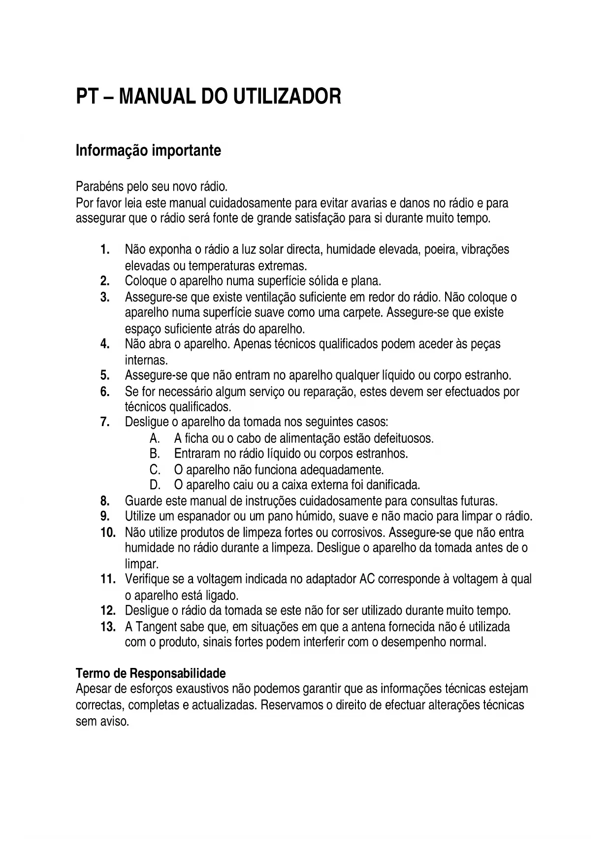 - Especificações PT – MANUAL DO UTILIZADOR Informação importante Parabéns pelo seu novo rádio. Por favor leia este manual cuidadosamente para evitar avarias e danos no rádio e para assegurar que o rádio será fonte de grande satisfação para si durante muito tempo. p. 121