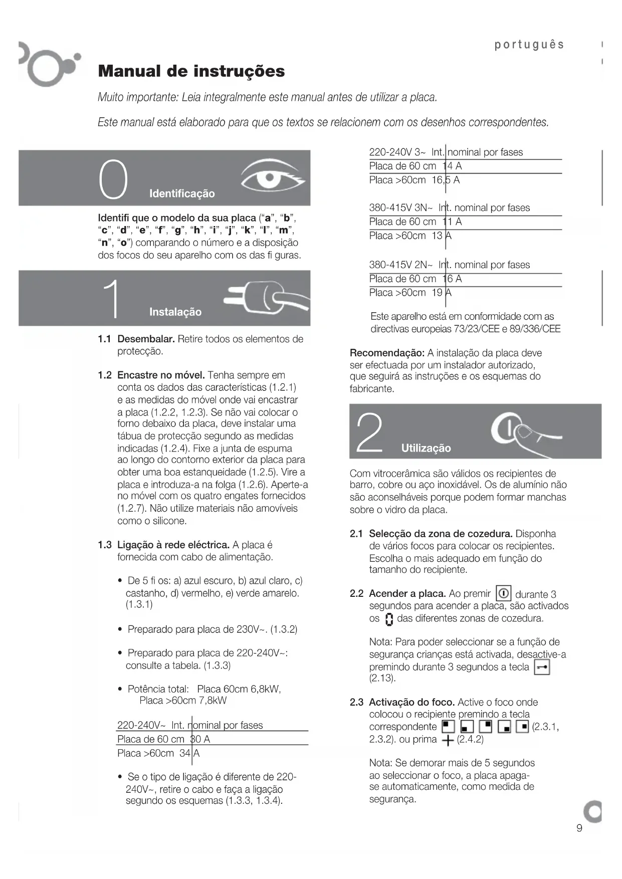 220-240V 3~ Int. nominal por fasesPlaca de 60 cm 14 APlaca >60cm 16,5 A380-415V 3N~ Int. nominal por fasesPlaca de 60 cm 11 APlaca >60cm 13 A380-415V 2N~ Int. nominal por fasesPlaca de 60 cm 16 APlaca >60cm 19 AEste aparelho está em conformidade com as directivas europeias 73/23/CEE e 89/336/CEERecomendação: A instalação da placa deve ser efectuada por um instalador autorizado, que seguirá as instruções e os esquemas do fabricante.