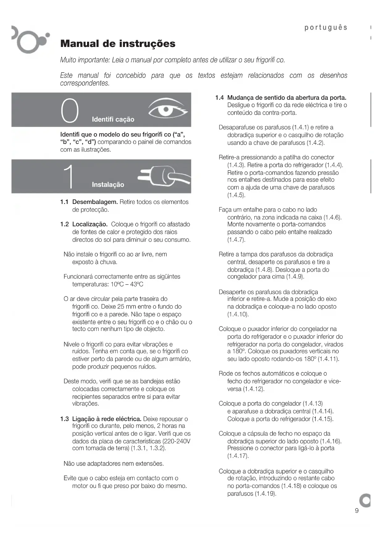 Manual de instruções Muito importante: Leia o manual por completo antes de utilizar o seu frigorífi co. Este manual foi concebido para que os textos estejam relacionados com os desenhos correspondentes. Instalação Identifi que o modelo do seu frigorífi co (“a”, “b”, “c”, “d”) comparando o painel de comandos com as ilustrações.
