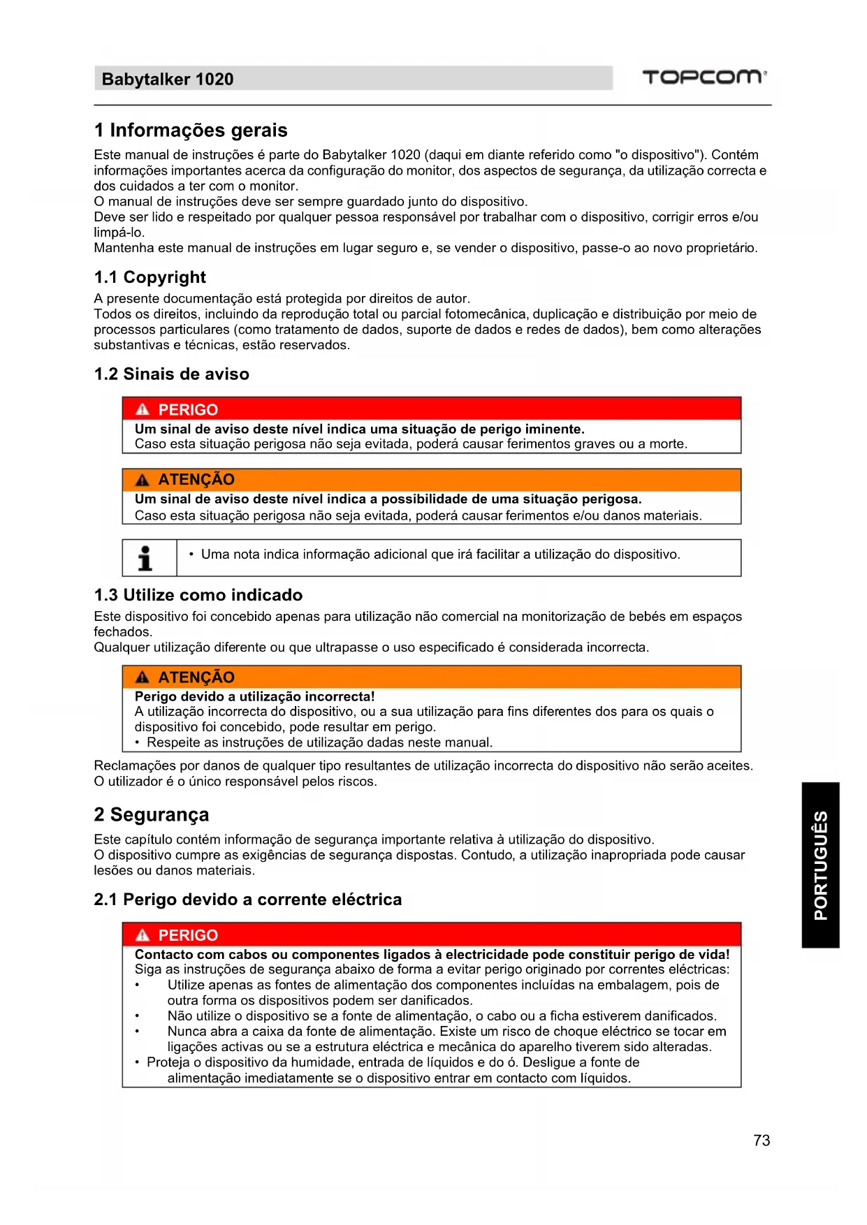 PORTUGUÊS 1 Informações gerais Este manual de instruções é parte do Babytalker 1020 (daqui em diante referido como "o dispositivo"). Contém informações importantes acerca da configuração do monitor, dos aspectos de segurança, da utilização correcta e dos cuidados a ter com o monitor. O manual de instruções deve ser sempre guardado junto do dispositivo. Deve ser lido e respeitado por qualquer pessoa responsável por trabalhar com o dispositivo, corrigir erros e/ou limpá-lo. Mantenha este manual de instruções em lugar seguro e, se vender o dispositivo, passe-o ao novo proprietário.