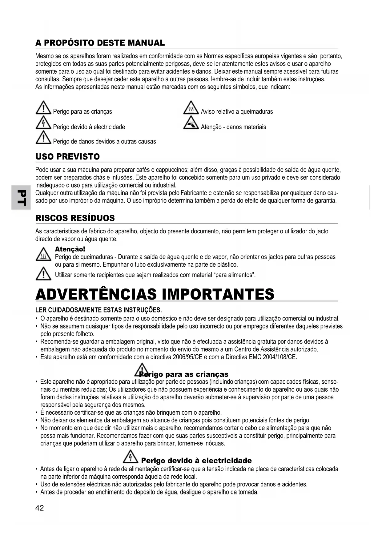 PT A PROPÓSITO DESTE MANUAL Mesmo se os aparelhos foram realizados em conformidade com as Normas especícas europeias vigentes e são, portanto,