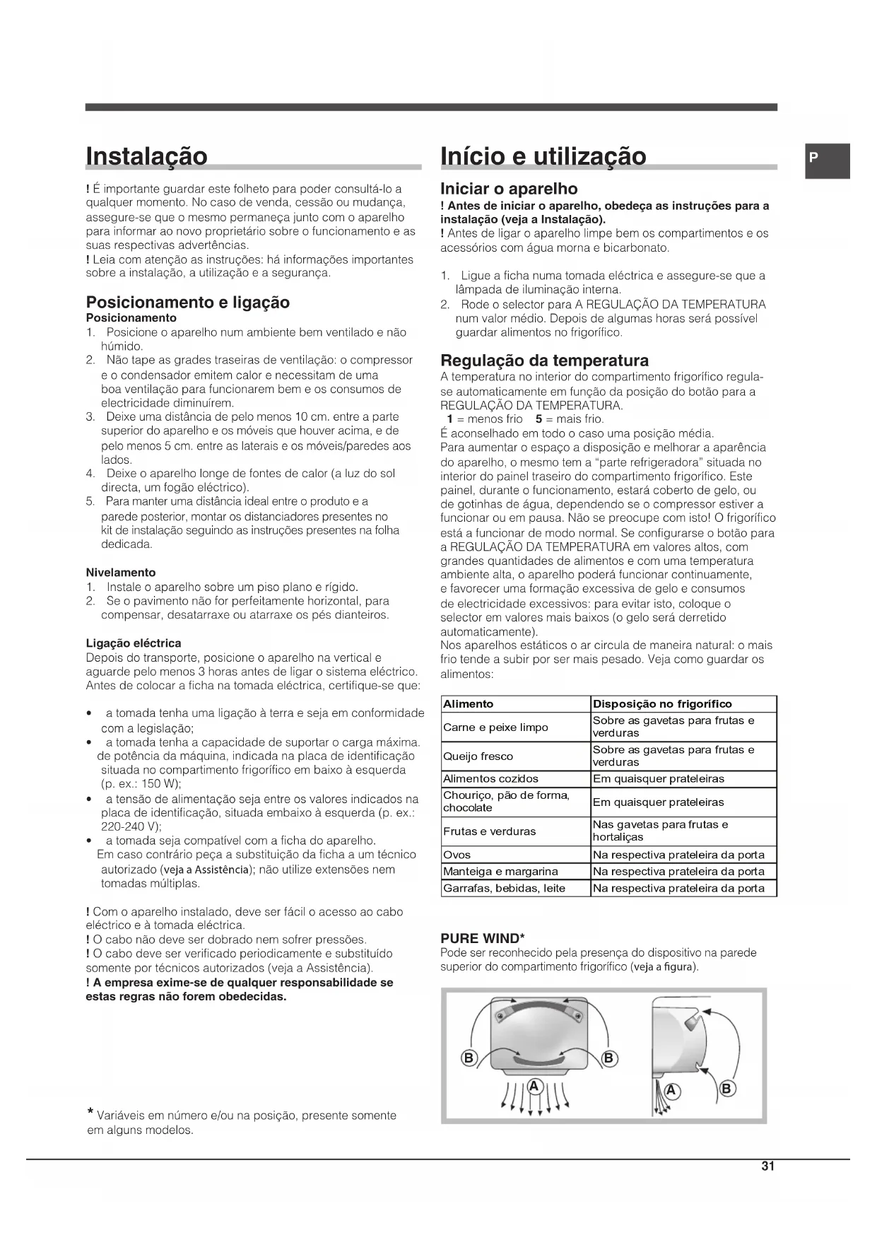 Instalação !Éimportanteguardarestefolhetoparapoderconsultá-loaqualquermomento.Nocasodevenda,cessãooumudança,assegure-sequeomesmopermaneçajuntocomoaparelhoparainformaraonovoproprietáriosobreofuncionamentoeassuasrespectivasadvertências.!Leiacomatençãoasinstruções:háinformaçõesimportantessobreainstalação,autilizaçãoeasegurança. Posicionamento e ligação Posicionamento1. Posicioneoaparelhonumambientebemventiladoenãohúmido.2. Nãotapeasgradestraseirasdeventilação:ocompressoreocondensadoremitemcalorenecessitamdeumaboaventilaçãoparafuncionarembemeosconsumosdeelectricidadediminuírem.3. Deixeumadistânciadepelomenos10cm.entreapartesuperiordoaparelhoeosmóveisquehouveracima,edepelomenos5cm.entreaslateraiseosmóveis/paredesaoslados.4. Deixeoaparelholongedefontesdecalor(aluzdosoldirecta,umfogãoeléctrico).5. Paramanterumadistânciaidealentreoprodutoeaparedeposterior,montarosdistanciadorespresentesnokitdeinstalaçãoseguindoasinstruçõespresentesnafolhadedicada.Nivelamento1. Instaleoaparelhosobreumpisoplanoerígido.2. Seopavimentonãoforperfeitamentehorizontal,paracompensar,desatarraxeouatarraxeospésdianteiros.Ligação eléctricaDepoisdotransporte,posicioneoaparelhonaverticaleaguardepelomenos3horasantesdeligarosistemaeléctrico.Antesdecolocarafichanatomadaeléctrica,certifique-seque:• atomadatenhaumaligaçãoàterraesejaemconformidadecomalegislação;• atomadatenhaacapacidadedesuportarocargamáxima. depotênciadamáquina,indicadanaplacadeidentificaçãosituadanocompartimentofrigoríficoembaixoàesquerda(p.ex.:150W);• atensãodealimentaçãosejaentreosvaloresindicadosnaplacadeidentificação,situadaembaixoàesquerda(p.ex.:220-240V);• atomadasejacompatívelcomafichadoaparelho. Emcasocontráriopeçaasubstituiçãodafichaaumtécnicoautorizado(veja a Assistência);nãoutilizeextensõesnemtomadasmúltiplas.!Comoaparelhoinstalado,deveserfáciloacessoaocaboeléctricoeàtomadaeléctrica.!Ocabonãodeveserdobradonemsofrerpressões.!Ocabodeveserverificadoperiodicamenteesubstituídosomenteportécnicosautorizados(vejaaAssistência).! A empresa exime-se de qualquer responsabilidade se estas regras não forem obedecidas. Início e utilização Iniciar o aparelho ! Antes de iniciar o aparelho, obedeça as instruções para a instalação (veja a Instalação).!Antesdeligaroaparelholimpebemoscompartimentoseosacessórioscomáguamornaebicarbonato.1. Ligueafichanumatomadaeléctricaeassegure-sequealâmpadadeiluminaçãointerna.2. RodeoselectorparaAREGULAÇÃODATEMPERATURAnumvalormédio.Depoisdealgumashorasserápossívelguardaralimentosnofrigorífico. Regulação da temperatura Atemperaturanointeriordocompartimentofrigoríficoregula-seautomaticamenteemfunçãodaposiçãodobotãoparaaREGULAÇÃODATEMPERATURA. 1 = menos frio 5 = mais frio.Éaconselhadoemtodoocasoumaposiçãomédia.Paraaumentaroespaçoadisposiçãoemelhoraraaparênciadoaparelho,omesmotema“parterefrigeradora”situadanointeriordopaineltraseirodocompartimentofrigorífico.Estepainel,duranteofuncionamento,estarácobertodegelo,oudegotinhasdeágua,dependendoseocompressorestiverafuncionarouempausa.Nãosepreocupecomisto!Ofrigoríficoestáafuncionardemodonormal.SeconfigurarseobotãoparaaREGULAÇÃODATEMPERATURAemvaloresaltos,comgrandesquantidadesdealimentosecomumatemperaturaambientealta,oaparelhopoderáfuncionarcontinuamente,efavorecerumaformaçãoexcessivadegeloeconsumosdeelectricidadeexcessivos:paraevitaristo,coloqueoselectoremvaloresmaisbaixos(ogeloseráderretidoautomaticamente). Nosaparelhosestáticosoarcirculademaneiranatural:omaisfriotendeasubirporsermaispesado.Vejacomoguardarosalimentos: Alimento Disposição no frigorífico Carne e peixe limpo Sobre as gavetas para frutas e verduras Queijo fresco Sobre as gavetas para frutas e verduras Alimentos cozidos Em quaisquer prateleiras Chouriço, pão de forma, chocolate Em quaisquer prateleiras Frutas e verduras Nas gavetas para frutas e hortaliças Ovos Na respectiva prateleira da porta Manteiga e margarina Na respectiva prateleira da porta Garrafas, bebidas, leite Na respectiva prateleira da porta PURE WIND* Podeserreconhecidopelapresençadodispositivonaparedesuperiordocompartimentofrigorífico(veja a gura).
