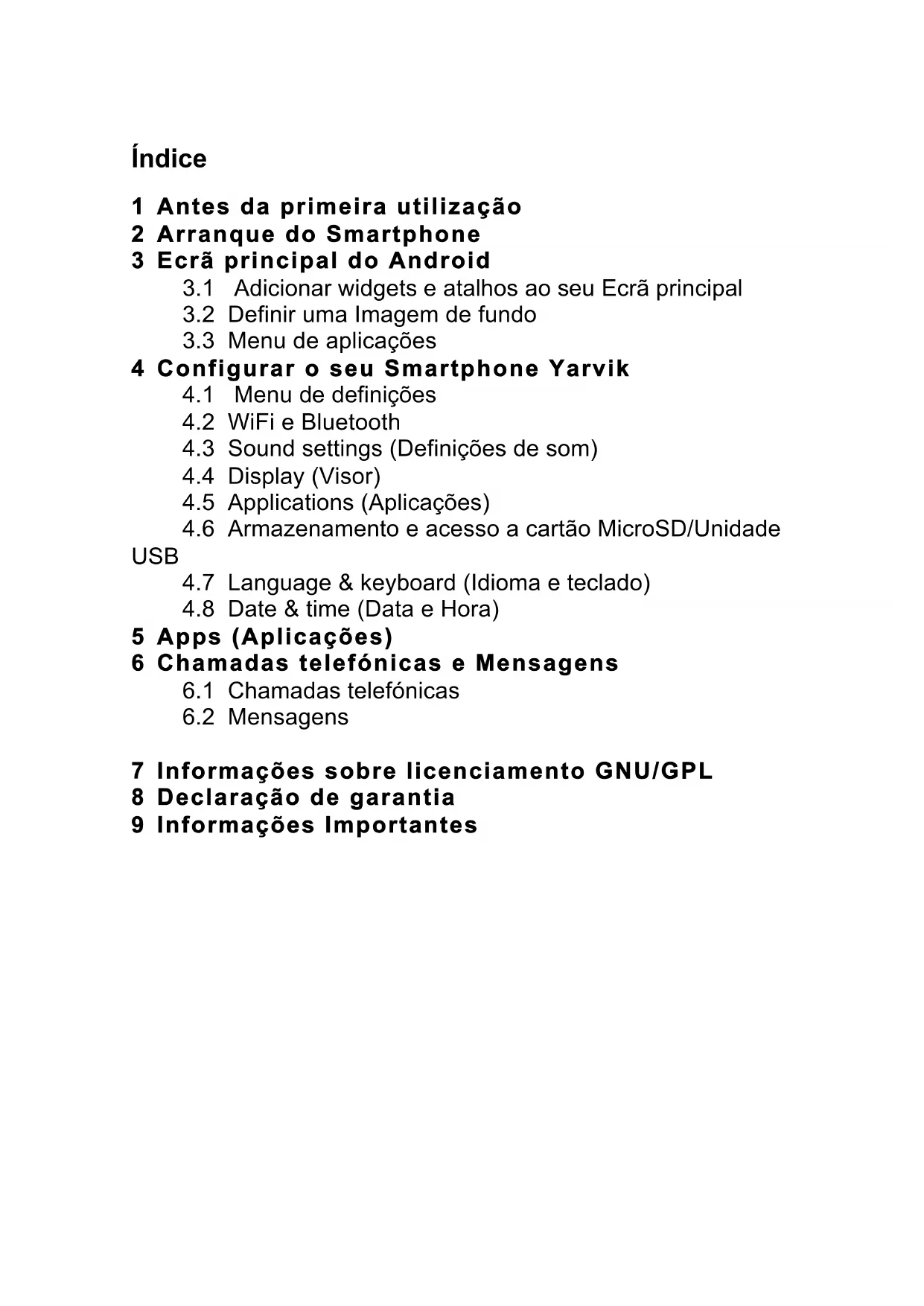 7 Informações sobre licenciamento GNU/GPL 8 Declaração de garantia 9 Informações Importantes1 Antes da primeira utilização Caro utilizador, Obrigado por adquirir o nosso produto. Para garantir uma utilização rápida e adequada do seu novo Smartphone Yarvik, leia atentamente estas instruções antes de começar a utilizá-lo. Esperamos que desfrute em pleno do seu Smartphone Yarvik durante o maior tempo possível! TENHA EM ATENÇÃO: o seu Smartphone Yarvik é um produto eletrónico de alta precisão, não tente desmontar o Smartphone, pois causará a anulação da sua garantia e poderá causar falhas no funcionamento do equipamento. - Evite que o produto sofra impactos fortes; - Evite a utilização do Smartphone em ambientes com temperaturas demasiado elevadas ou baixas, ou em qualquer ambiente em que o equipamento possa entrar em contacto com humidade, pó ou campos magnéticos; - Não exponha o Smartphone a luz solar intensa durante períodos prolongados de tempo; - Não utilize o ecrã táctil do Smartphone com objetos pontiagudos, pois poderá riscar o ecrã; - O uso prolongado de auscultadores ligados ao Smartphone e/ou com o volume demasiado alto pode causar problemas auditivos graves; - Para evitar acidentes de trânsito, não atravesse a rua, nem conduza veículos motorizados ou bicicleta enquanto utiliza o Smartphone com auscultadores; - Utilize apenas baterias, carregadores e acessórios autorizados no Smartphone Yarvik. A utilização de quaisquer outros produtos no Smartphone pode ser perigosa e violar as condições da garantia; - Utilize apenas um pano de algodão ligeiramente humedecido só em água para limpar o Smartphone. O Smartphone não deve ser limpo com qualquer tipo de produto de limpeza (para vidros). Pode começar a utilizar o seu Smartphone Yarvik assim que o retira da embalagem, sem ter de carregar primeiro a bateria. É melhor para a bateria ser utilizada pela primeira vez com a carga de que ainda dispõe e ser depois completamente recarregada, uma vez esgotada toda a carga inicial. Se o Smartphone não ligar quando o retira da embalagem, a bateria já está completamente descarregada e deve então recarregá-la primeiro.2 Arranque do Smartphone Quando liga pela primeira vez o seu Smartphone Yarvik, é-lhe apresentada a sequência de arranque. O primeiro arranque pode demorar um pouco, aproximadamente 2 a 3 minutos. Após a sequência de arranque, o Smartphone concluiu o arranque e é-lhe apresentado o Ecrã de bloqueio do Android.