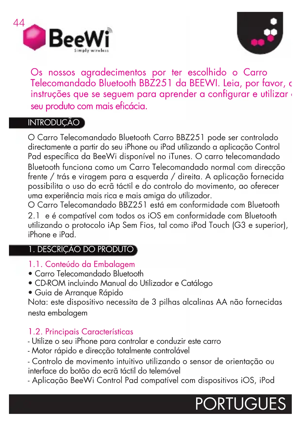 - Guia de Arranque Rápido Nota: este dispositivo necessita de 3 pilhas alcalinas AA não fornecidas nesta embalagem 1.2. Principais Características - Utilize o seu iPhone para controlar e conduzir este carro - Motor rápido e direcção totalmente controlável - Controlo de movimento intuitivo utilizando o sensor de orientação ou interface do botão do ecrã táctil do telemóvel - Aplicação BeeWi Control Pad compatível com dispositivos iOS, iPod Os nossos agradecimentos por ter escolhido o Carro Telecomandado Bluetooth BBZ251 da BEEWI. Leia, por favor, as instruções que se seguem para aprender a configurar e utilizar o seu produto com mais eficácia. INTRODUÇÃO