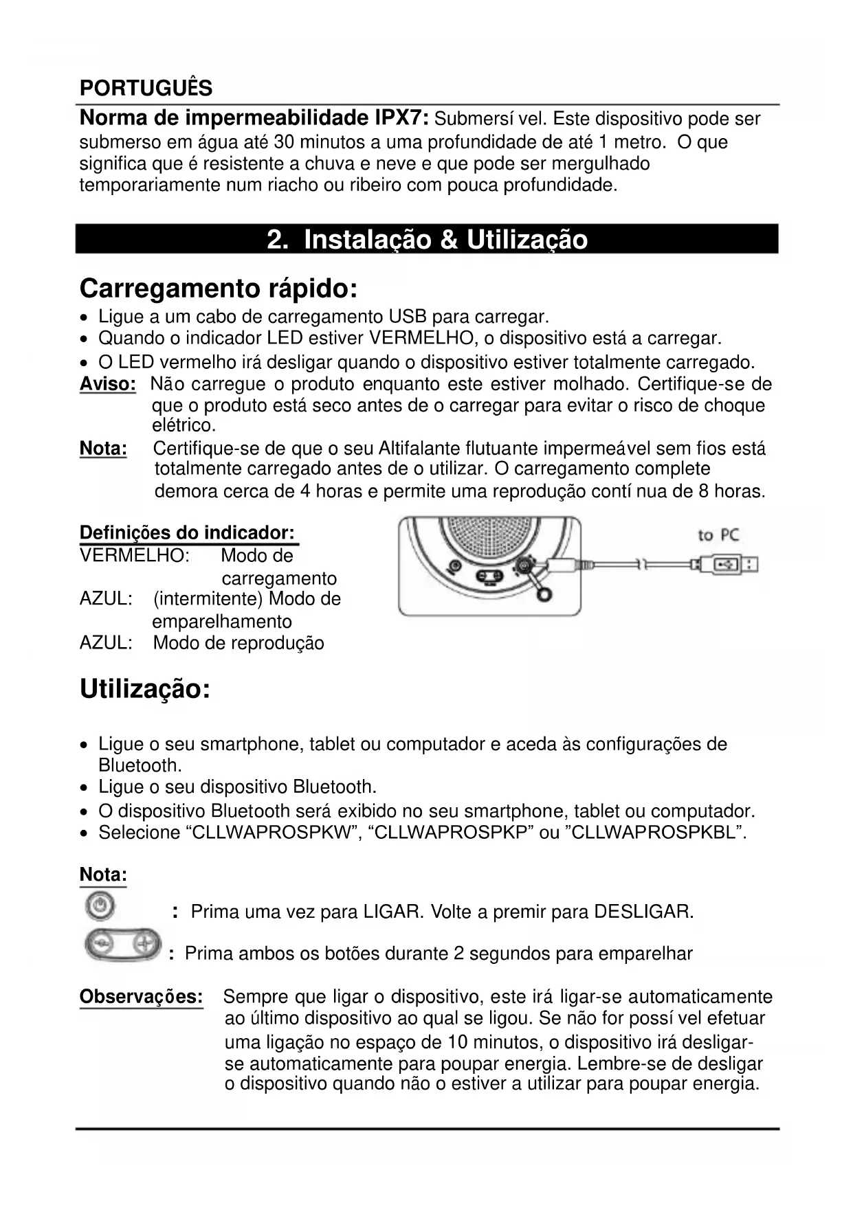 Carregamento rápido: Ligue a um cabo de carregamento USB para carregar. Quando o indicador LED estiver VERMELHO, o dispositivo está a carregar. O LED vermelho irá desligar quando o dispositivo estiver totalmente carregado. Aviso: Não carregue o produto enquanto este estiver molhado. Certifique-se de que o produto está seco antes de o carregar para evitar o risco de choque elétrico. Nota: Certifique-se de que o seu Altifalante flutuante impermeável sem fios está totalmente carregado antes de o utilizar. O carregamento complete demora cerca de 4 horas e permite uma reprodução contínua de 8 horas. Definições do indicador: VERMELHO: Modo de carregamento AZUL: (intermitente) Modo de emparelhamento AZUL: Modo de reprodução Utilização: Ligue o seu smartphone, tablet ou computador e aceda às configurações de Bluetooth. Ligue o seu dispositivo Bluetooth. O dispositivo Bluetooth será exibido no seu smartphone, tablet ou computador. Selecione “CLLWAPROSPKW”, “CLLWAPROSPKP” ou ”CLLWAPROSPKBL”. Nota: : Prima uma vez para LIGAR. Volte a premir para DESLIGAR. : Prima ambos os botões durante 2 segundos para emparelhar Observações: Sempre que ligar o dispositivo, este irá ligar-se automaticamente ao último dispositivo ao qual se ligou. Se não for possível efetuar uma ligação no espaço de 10 minutos, o dispositivo irá desligar- se automaticamente para poupar energia. Lembre-se de desligar o dispositivo quando não o estiver a utilizar para poupar energia.PORTUGUÊS