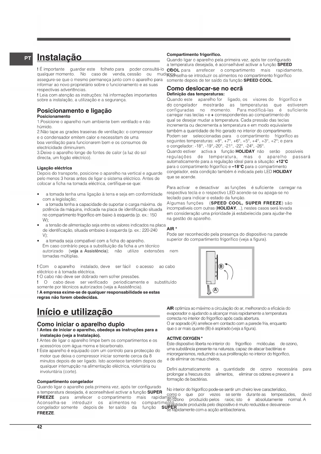 AIR optimizaaomáximoacirculaçãodoar,melhorandoaeficáciado evaporadoreajudandoaalcançarmaisrapidamenteatemperatura correctanointeriordofrigoríficoapóscadaabertura. Oarsoprado(A)arrefeceemcontactocomaparedefria,enquanto queoarmaisquente(B)éaspirado(vejaafigura). ACTIVE OXYGEN * Estedispositivolibertanointeriordo frigorífico moléculas deozono, umasubstânciapresentenanatureza,capazdeatacarbactériase microrganismos,reduzindoasuaproliferaçãonointeriordofrigorífico, edeeliminarosmauscheiros. Definiautomaticamente a quantidade de ozono necessária para prolongarafrescurados alimentos, eliminarosodoreseprevenira formaçãodebactérias. Nointeriordofrigoríficopode-sesentirumcheirolevecaracterístico, comoo que por vezes sesente duranteas tempestades, devido aoozono produzidopelos raios;isto é absolutamente normal.A quantidadeproduzidapelodispositivoémuitoreduzidaedesvanece- serapidamentecomaacçãoantibacteriana.PT