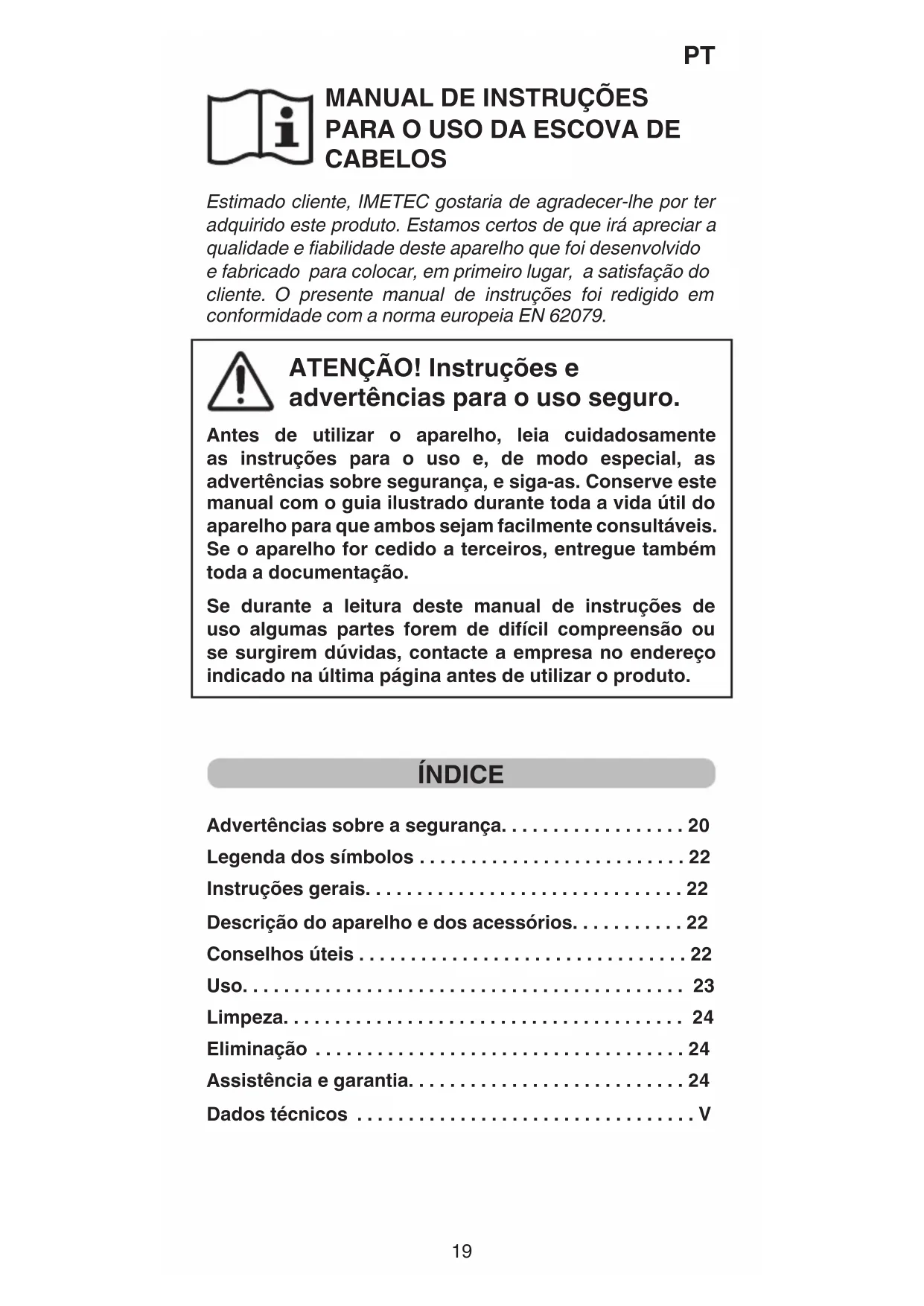 MI001123.indd 6 21/02/13 22.57MANUAL DE INSTRUÇÕES PARA O USO DA ESCOVA DE CABELOS Estimado cliente, IMETEC gostaria de agradecer-lhe por ter