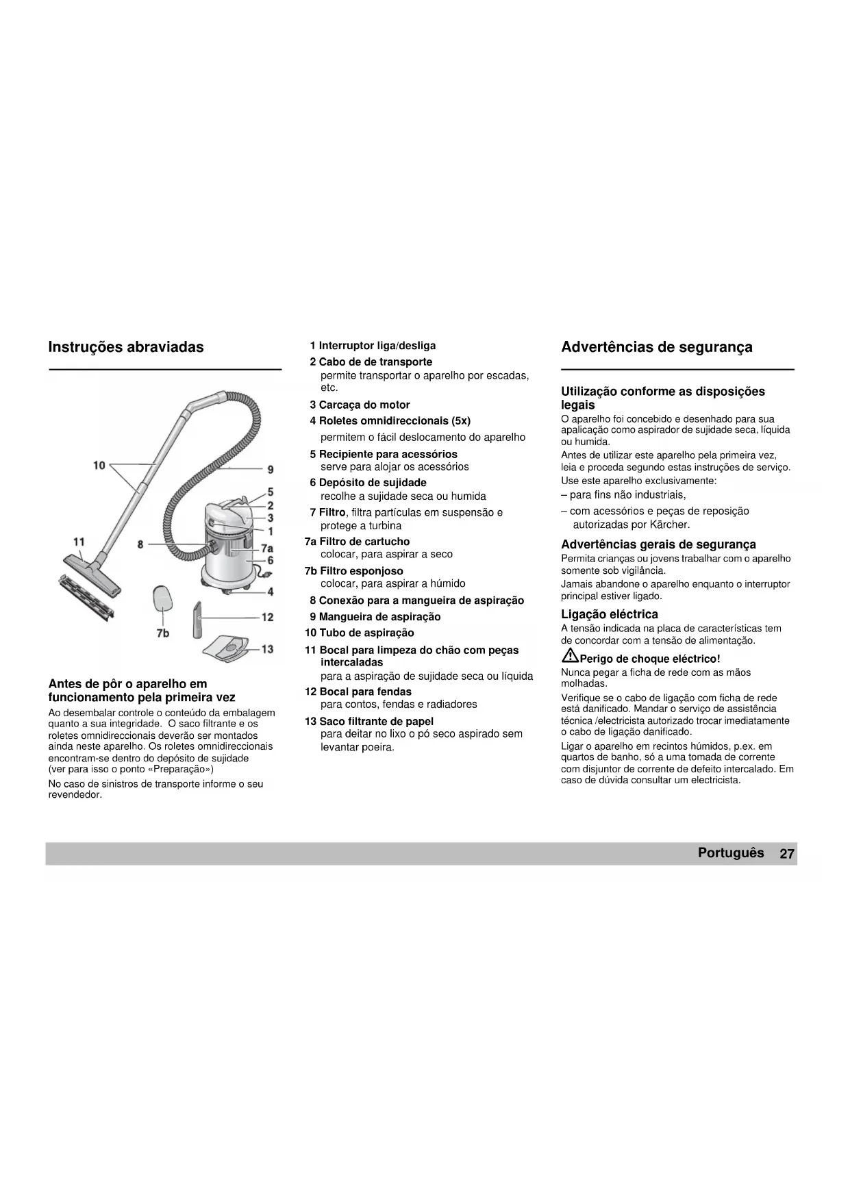 legais O aparelho foi concebido e desenhado para sua apalicação como aspirador de sujidade seca, líquida ou humida. Antes de utilizar este aparelho pela primeira vez, leia e proceda segundo estas instruções de serviço.Use este aparelho exclusivamente: – para fins não industriais,
