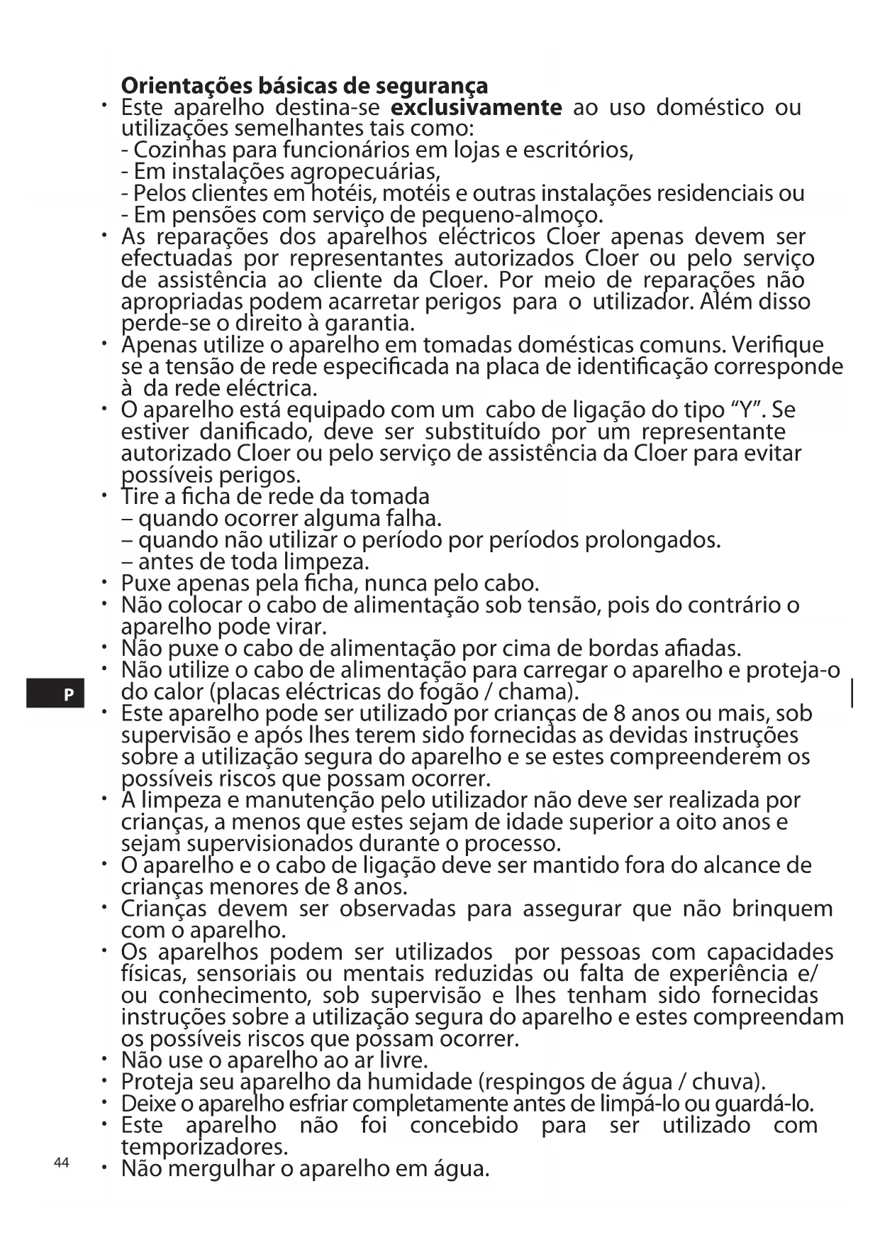 Orientações básicas de segurança Este aparelho destina-se exclusivamente ao uso doméstico ou utilizações semelhantes tais como: - Cozinhas para funcionários em lojas e escritórios, - Em instalações agropecuárias, - Pelos clientes em hotéis, motéis e outras instalações residenciais ou - Em pensões com serviço de pequeno-almoço. As reparações dos aparelhos eléctricos Cloer apenas devem ser efectuadas por representantes autorizados Cloer ou pelo serviço de assistência ao cliente da Cloer. Por meio de reparações não apropriadas podem acarretar perigos para o utilizador. Além disso perde-se o direito à garantia. Apenas utilize o aparelho em tomadas domésticas comuns. Verique se a tensão de rede especicada na placa de identicação corresponde à da rede eléctrica. O aparelho está equipado com um cabo de ligação do tipo “Y”. Se estiver danicado, deve ser substituído por um representante autorizado Cloer ou pelo serviço de assistência da Cloer para evitar possíveis perigos. Tire a cha de rede da tomada – quando ocorrer alguma falha. – quando não utilizar o período por períodos prolongados. – antes de toda limpeza. Puxe apenas pela cha, nunca pelo cabo. Não colocar o cabo de alimentação sob tensão, pois do contrário o aparelho pode virar. Não puxe o cabo de alimentação por cima de bordas aadas. Não utilize o cabo de alimentação para carregar o aparelho e proteja-o do calor (placas eléctricas do fogão / chama). Este aparelho pode ser utilizado por crianças de 8 anos ou mais, sob supervisão e após lhes terem sido fornecidas as devidas instruções sobre a utilização segura do aparelho e se estes compreenderem os possíveis riscos que possam ocorrer. A limpeza e manutenção pelo utilizador não deve ser realizada por crianças, a menos que estes sejam de idade superior a oito anos e sejam supervisionados durante o processo. O aparelho e o cabo de ligação deve ser mantido fora do alcance de crianças menores de 8 anos. Crianças devem ser observadas para assegurar que não brinquem com o aparelho. Os aparelhos podem ser utilizados por pessoas com capacidades físicas, sensoriais ou mentais reduzidas ou falta de experiência e/ ou conhecimento, sob supervisão e lhes tenham sido fornecidas instruções sobre a utilização segura do aparelho e estes compreendam os possíveis riscos que possam ocorrer. Não use o aparelho ao ar livre. Proteja seu aparelho da humidade (respingos de água / chuva). Deixe o aparelho esfriar completamente antes de limpá-lo ou guardá-lo. Este aparelho não foi concebido para ser utilizado com temporizadores. Não mergulhar o aparelho em água.