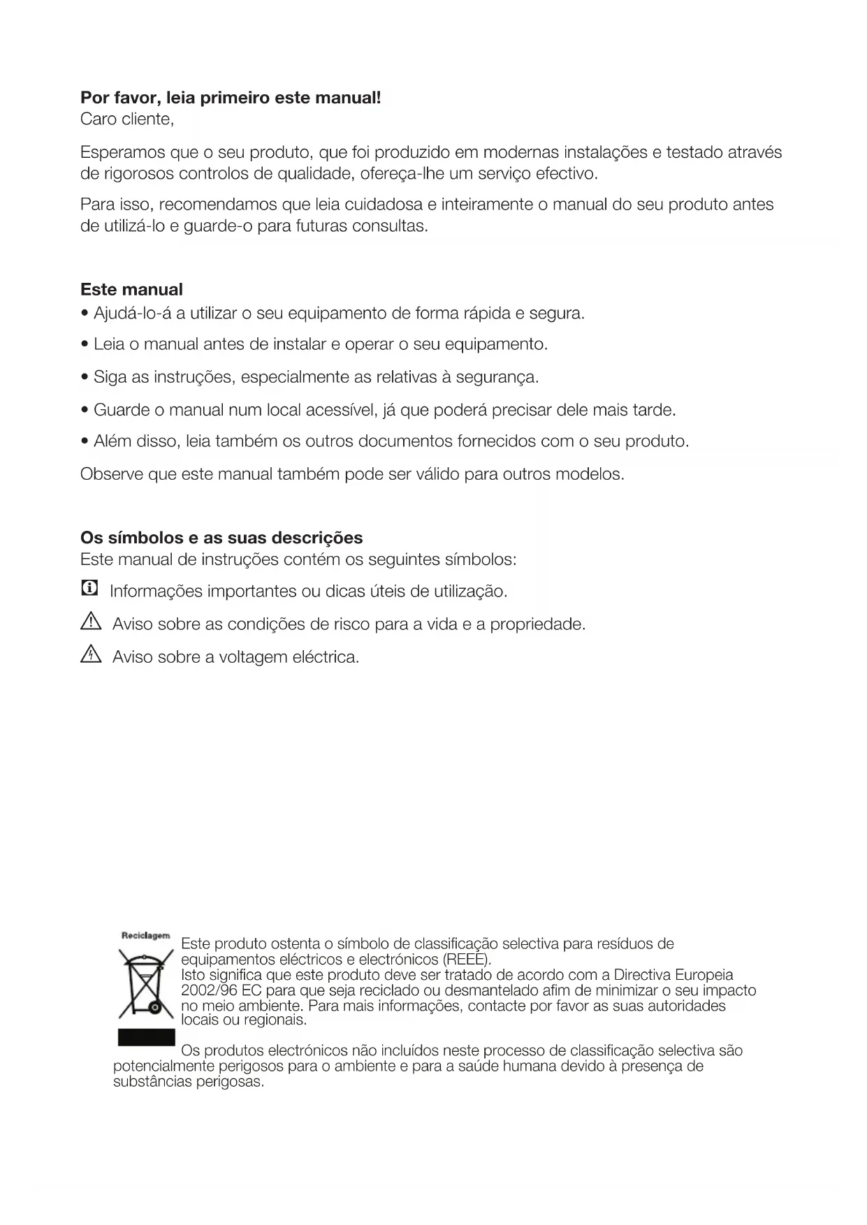 - Além disso, leia também os outros documentos fornecidos com o seu produto. Observe que este manual também pode ser válido para outros modelos. Os símbolos e as suas descrições Este manual de instruções contém os seguintes símbolos: C Informações importantes ou dicas úteis de utilização. A Aviso sobre as condições de risco para a vida e a propriedade. B Aviso sobre a voltagem eléctrica. Este produto ostenta o símbolo de classificação selectiva para resíduos de equipamentos eléctricos e electrónicos (REEE). Isto significa que este produto deve ser tratado de acordo com a Directiva Europeia 2002/96 EC para que seja reciclado ou desmantelado afim de minimizar o seu impacto no meio ambiente. Para mais informações, contacte por favor as suas autoridades locais ou regionais. Os produtos electrónicos não incluídos neste processo de classificação selectiva são potencialmente perigosos para o ambiente e para a saúde humana devido à presença de substâncias perigosas.PT
