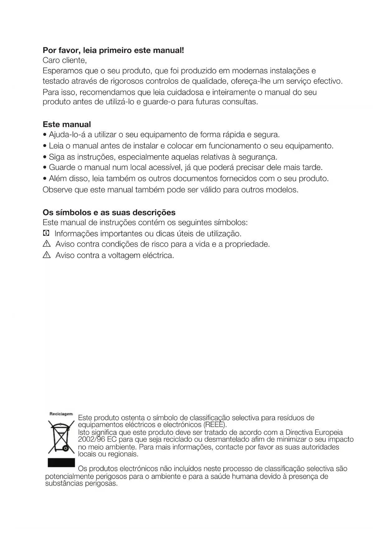 - Leia o manual antes de instalar e colocar em funcionamento o seu equipamento.