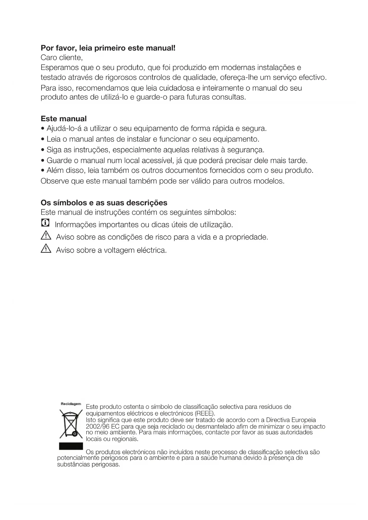 - Além disso, leia também os outros documentos fornecidos com o seu produto. Observe que este manual também pode ser válido para outros modelos. Os símbolos e as suas descrições Este manual de instruções contém os seguintes símbolos: C Informações importantes ou dicas úteis de utilização. A Aviso sobre as condições de risco para a vida e a propriedade. B Aviso sobre a voltagem eléctrica. Este produto ostenta o símbolo de classificação selectiva para resíduos de equipamentos eléctricos e electrónicos (REEE). Isto significa que este produto deve ser tratado de acordo com a Directiva Europeia 2002/96 EC para que seja reciclado ou desmantelado afim de minimizar o seu impacto no meio ambiente. Para mais informações, contacte por favor as suas autoridades locais ou regionais. Os produtos electrónicos não incluídos neste processo de classificação selectiva são potencialmente perigosos para o ambiente e para a saúde humana devido à presença de substâncias perigosas.PT